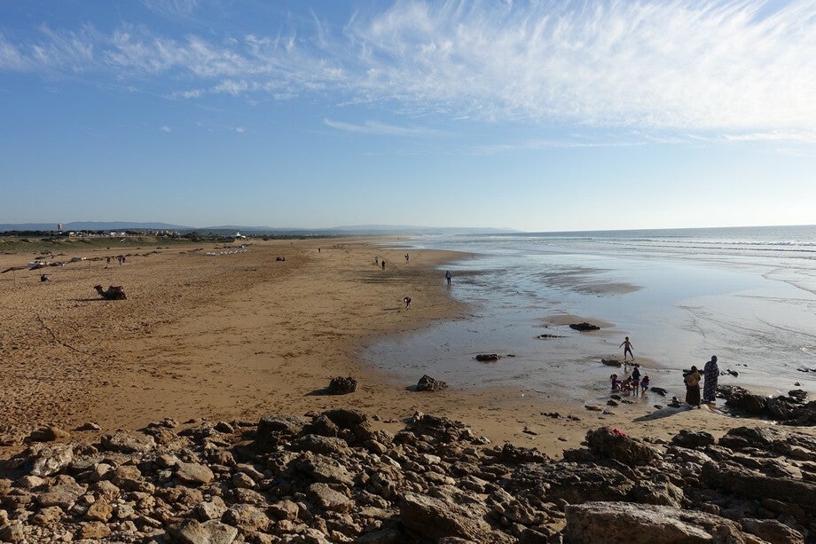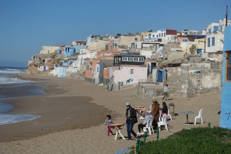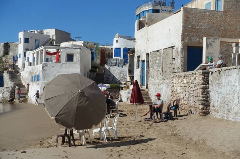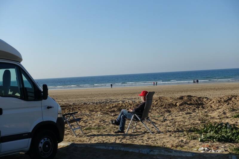 Na even door het dorp en op het strand gestruind te hebben zijn we op een “terrasje” beland waar we een tajine besteld hebben, de eerste deze reis. Het zat heerlijk in het zonnetje, ondertussen konden we de vissers gadeslaan die hun verse vangst op de camping komen verkopen en na drie kwartier was de tajine klaar. We waren intussen wel verhuisd want het water kwam akelig dichtbij. Onze schoenen hadden we uitgedaan dus af en toe even de voetjes omhoog. Heerlijk om zo met je blote voeten in het zand te zitten eten, doen we ook niet alle dagen!