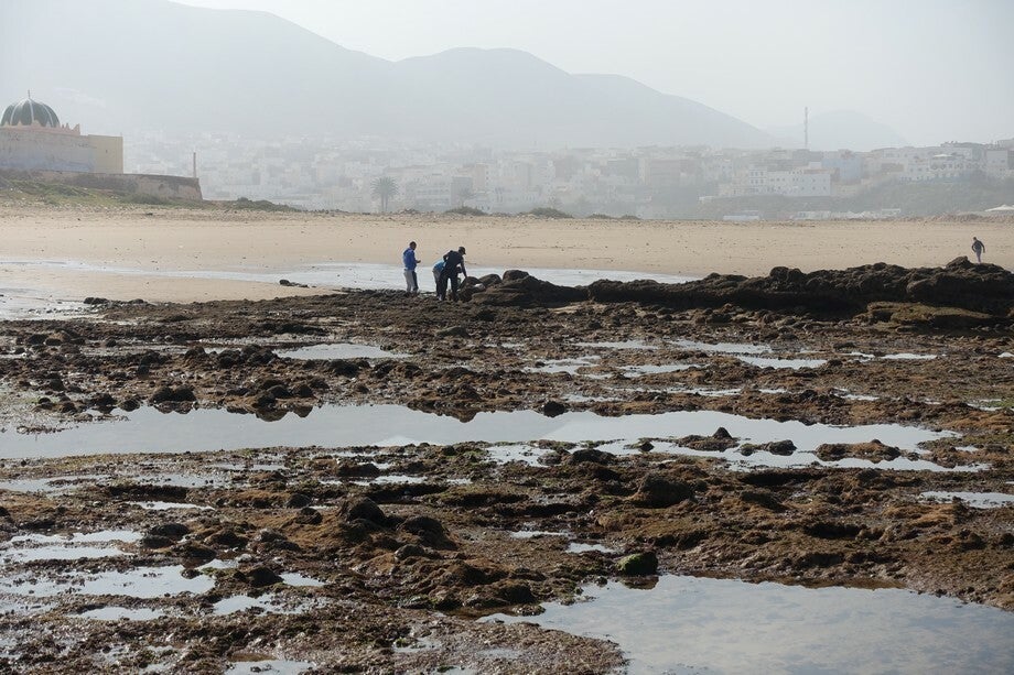 ’s Ochtends is het laag water en ook dan is het mooi om over het strand te lopen. Er wordt tussen de stenen dan druk gezocht naar mosselen, inktvissen en zee-egeltjes want dat is allemaal eetbaar.