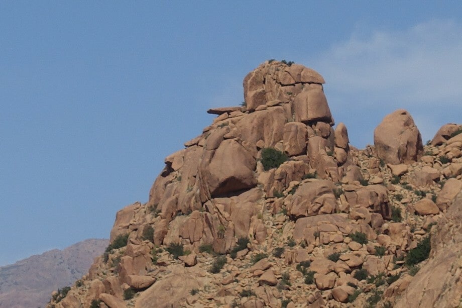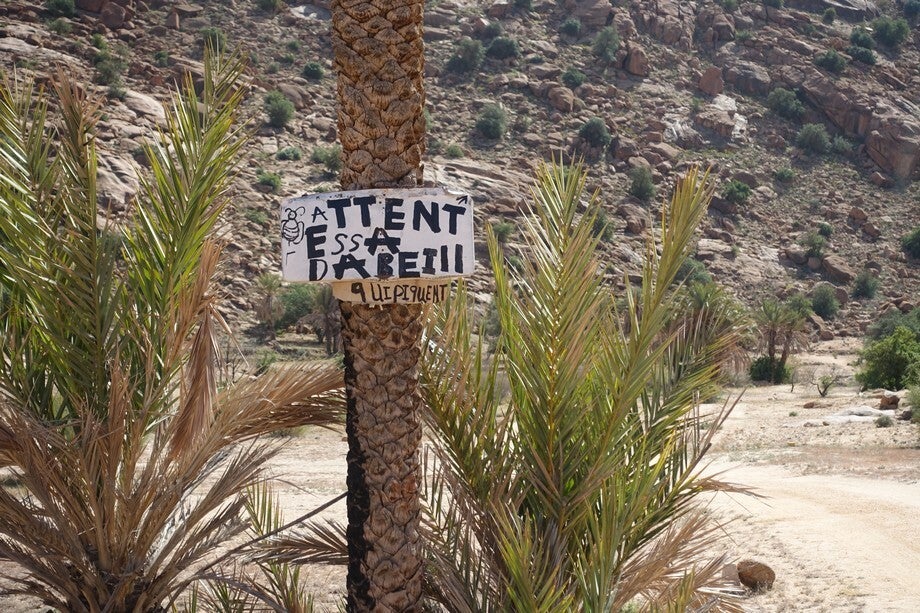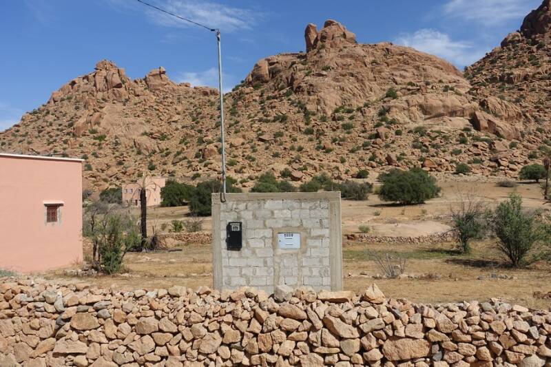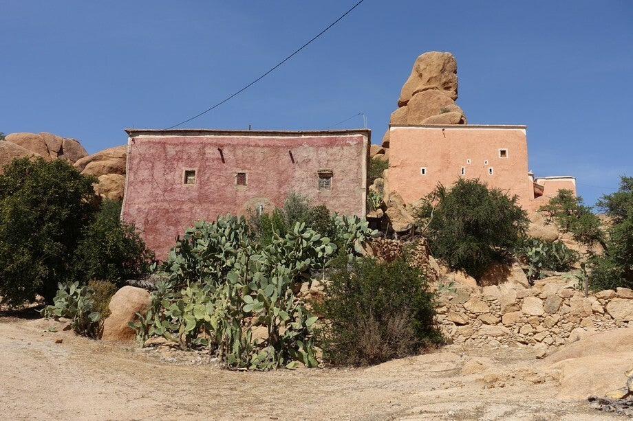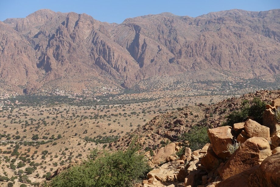 Na de koffie zijn we aan de wandel gegaan. Achter in het dal kun je over een soort pasje omhoog lopen, als je boven bent moet je nog een klein eindje door en dan kun je mooi in het amelndal kijken. Ook op dit pad liggen grote rotsen en er groeien grote bolvormige cactussen. Langs het wandelpad naar het pasje staan een paar tenten waar mensen in wonen die geiten houden en kippen. Er staan ook bijenkorven.