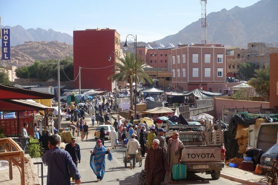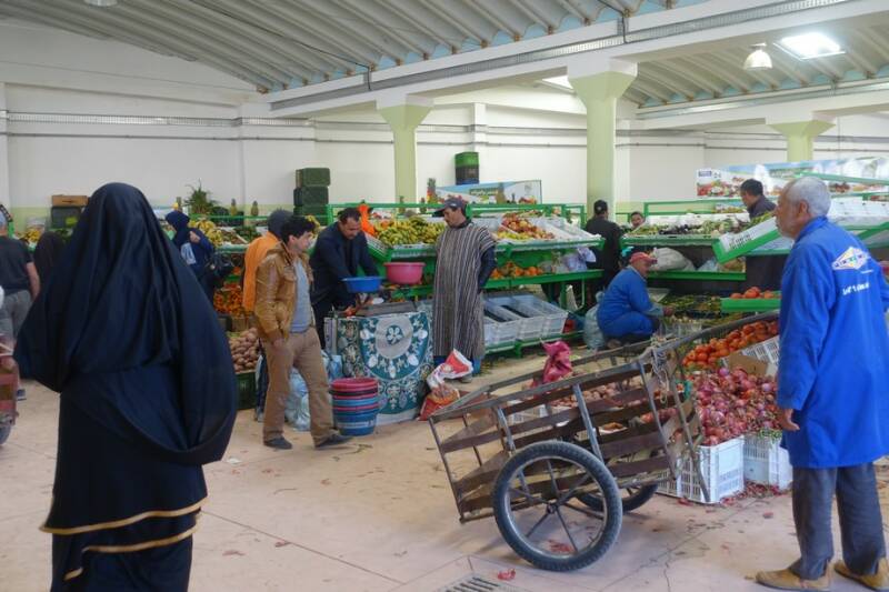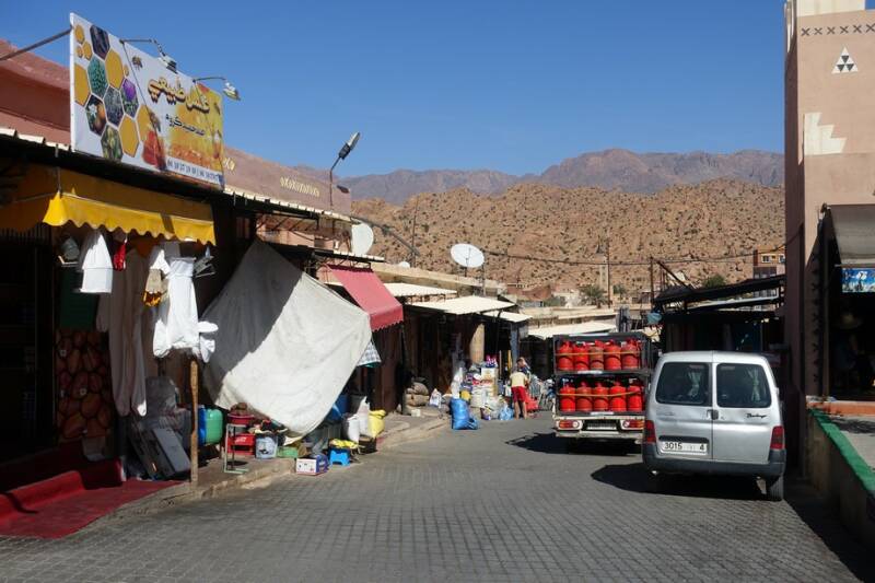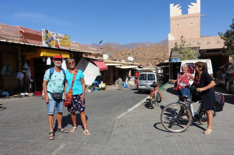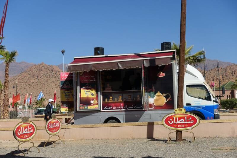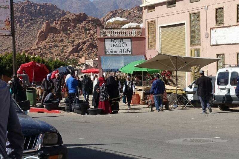 De marktkraampjes waren gisteravond dicht dus vanmorgen na de koffie zijn we naar het dorp gegaan. Waar in Nederland een bierwagen zou staan, staat hier een theewagen. Er waren veel kraampjes met locale producten zoals arganolie, honing, safraan, kruiden, zeepjes, sieraden,mandjes, houtsnijwerk en kleding.