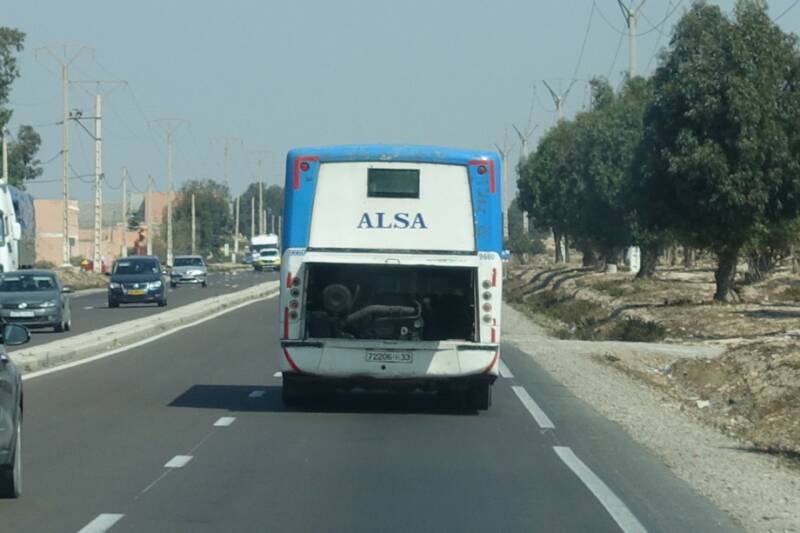 Vanaf Tiznit is het een doorgaande weg naar Agadir. Het was erg druk op de weg, in een paar dorpjes was het souk en dat geeft extra drukte. De lijnbus voor ons was denk ik warm gelopen, dit zien we wel vaker.