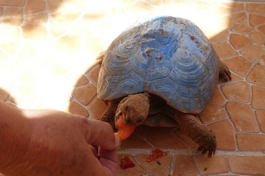 Vanmiddag hebben we lekker gegeten in de tuin van een hotel, vorig jaar waren we hier ook al een keer geweest en het eten is nog steeds lekker. Er loopt inmiddels een blauw geverfde schildpad, net als de rotsen. Eerst vonden we het niet zo leuk maar het beestje lijkt het zelf niet erg te vinden. Hij is gek op groente en eet tomaat uit je hand!