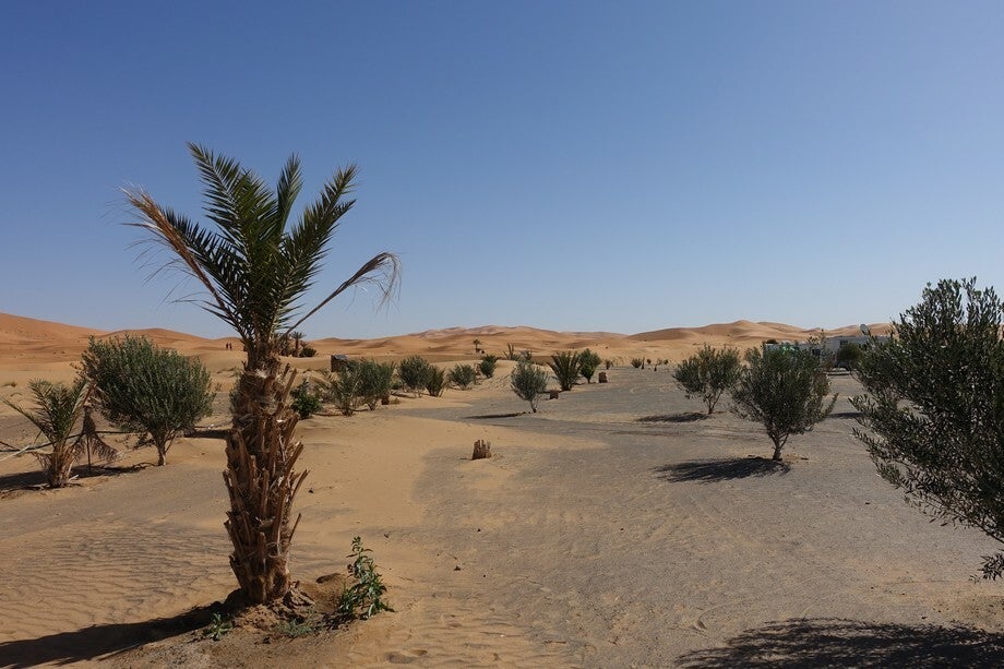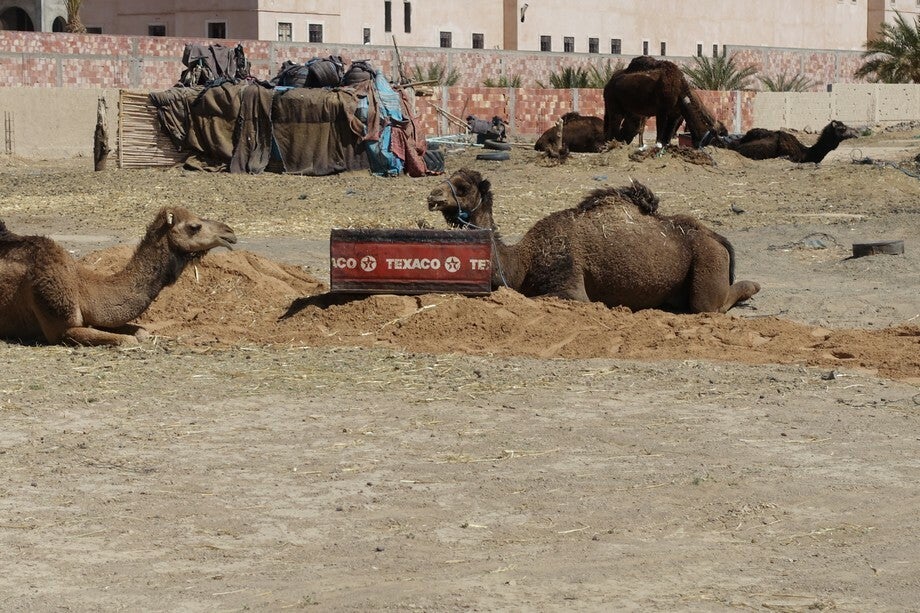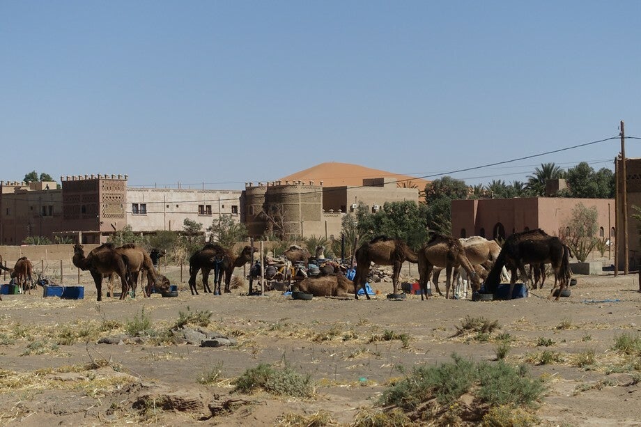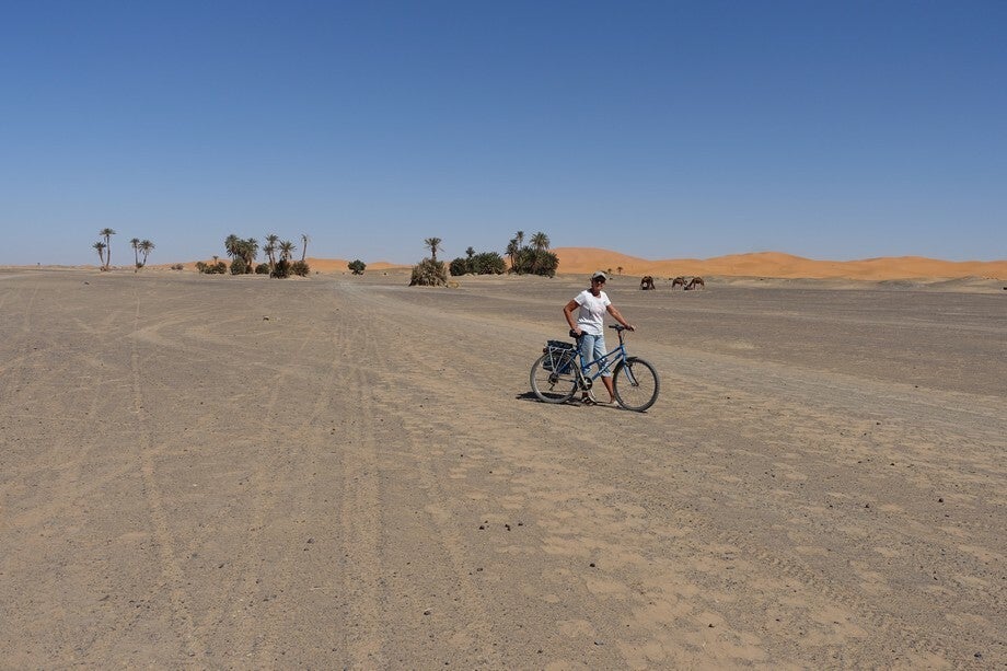Daarna zijn we naar Hassibalied gefietst, het dorpje vlakbij de camping. Als je het dorp uitfietst kom je op een grote kale vlakte bij de duinen. Hier staan heel veel dromedarissen te wachten om ’s avonds de duinen in te gaan met toeristen. Heel bijzonder om hier even te fietsen.