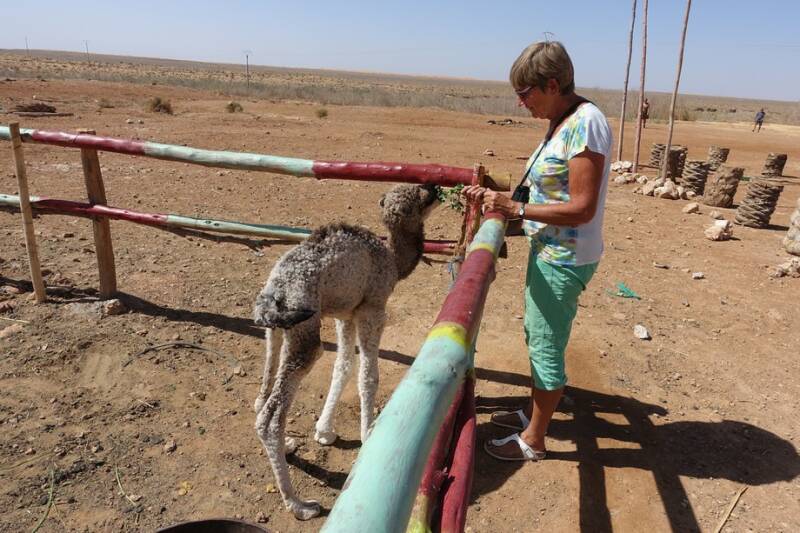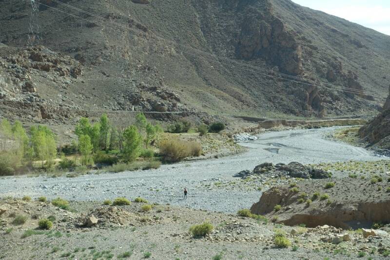 Na de eerste pas was het tijd voor koffie. We stonden net en toen kwam er iemand uit de rivierbedding omhoog klimmen. We negeerden hem maar. Maar toen de koffie op was, was zijn moeder ook gearriveerd met een hele kudde geiten. Ze wilde voor dirhams op de foto met een geitje in haar armen. Dit wilden we niet, ze liet het beestje op de grond vallen en we zijn weggereden.