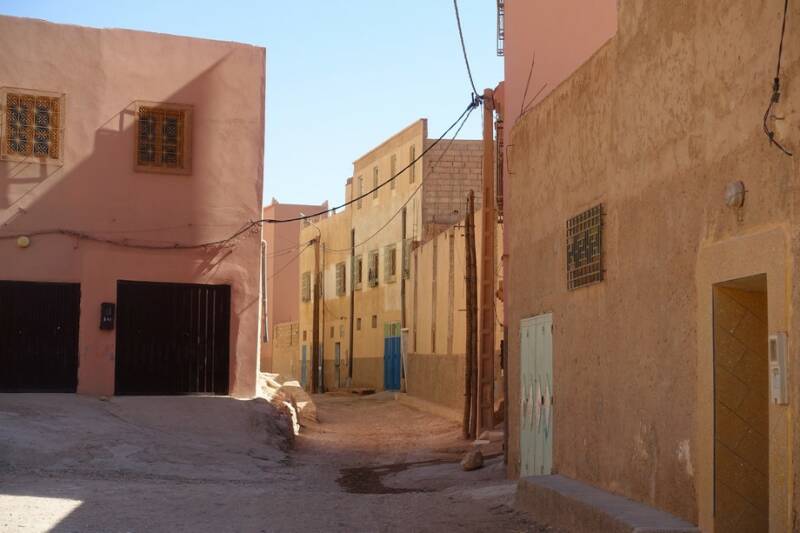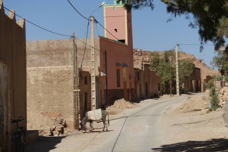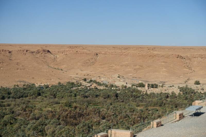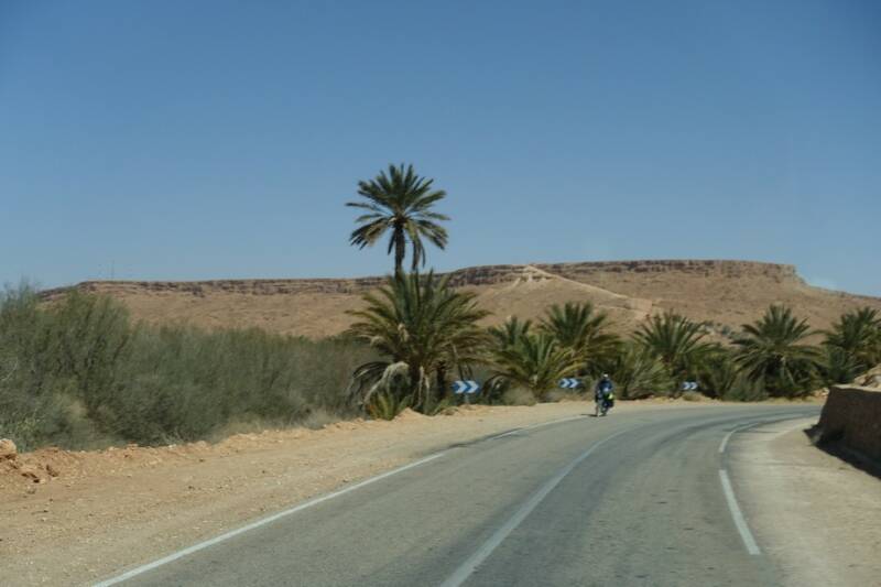 Na het dorp is een zijweggetje. Die gingen we in en toen kwamen we bij de rivier de Ziz. Zo heet dit dal ook, het Ziz-dal. Via deze weg kun je naar de overkant van het dal, door weer een klein dorpje en dan een stukje omhoog. Hier is weer mooi uitzicht op de palmbomen en dorpjes.