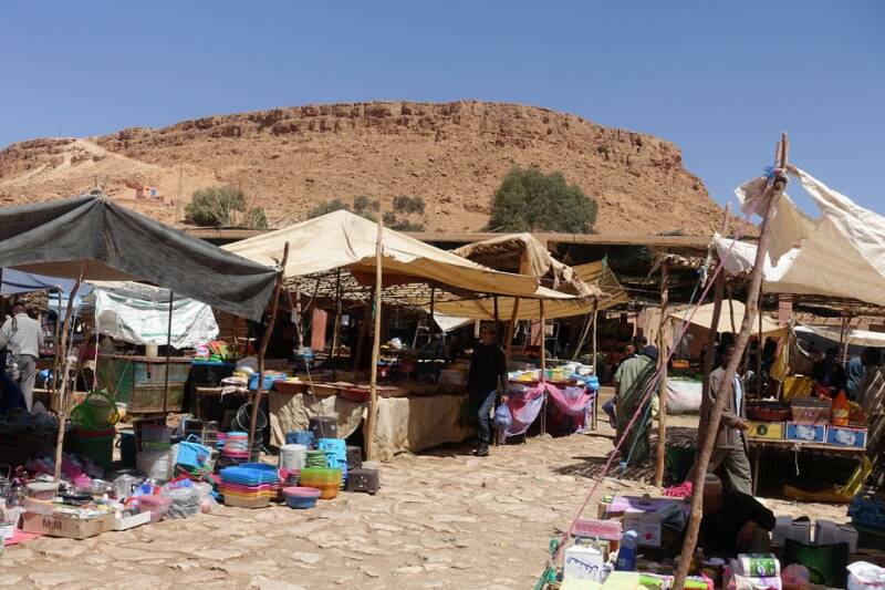 Een stukje verderop in het dorpje Aoufouss was het markt. Daar wilden we even zoeken naar een brandertje voor onder de tajine. Toevallig stond er één. Ik begreep dat hij 50 dirham moest kosten. Dat was prima, ik gaf 50 dirham en kreeg nog 35 terug. Dus voor nog geen € 1,50 hebben wij een brandertje! De koopman was ook heel eerlijk want voor 50 hadden we hem ook meegenomen. Ook nog lekkere banaantjes meegenomen, van die hele kleine en toen zagen we ook nog aardbeien en peper voor een koopje. Dat was een vruchtbaar rondje markt.