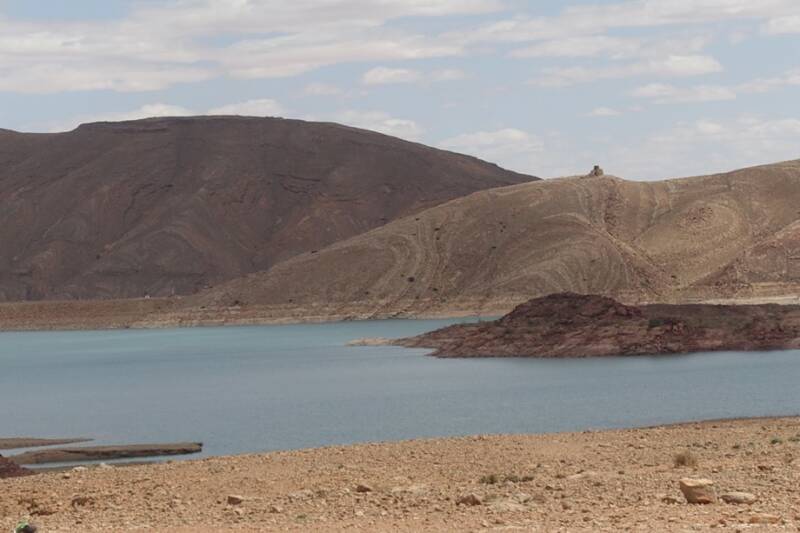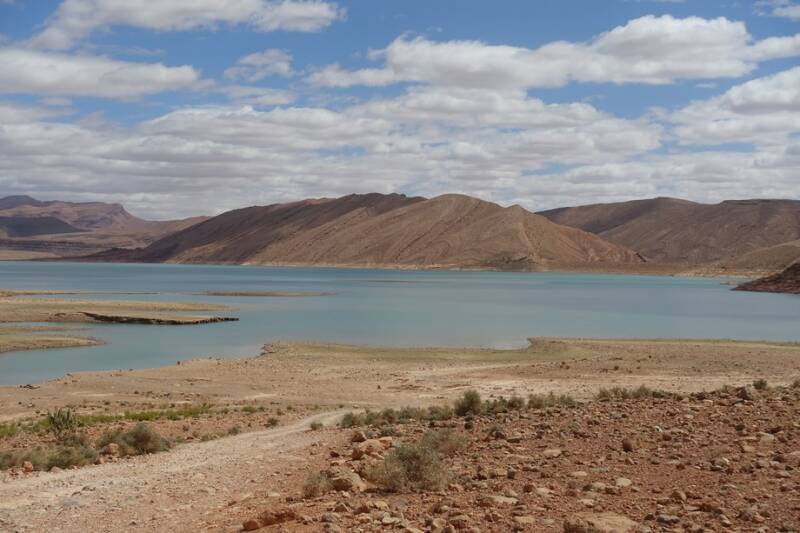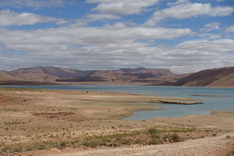 De volgende stop was de Acima supermarkt in Er Rachidia. Hierna door richting Midelt, dit was voor ons een nieuwe route. Je rijdt zo de bergen in en dan komt al gauw het stuwmeer in zicht. Er kwam een parkeerplaats met mooi uitzicht. Hiervandaan zijn we naar het meer gelopen. De wolkenlucht gaf mooie schaduwen op de bergen. Prachtig! Na een broodje gegeten te hebben was het nog een stukje naar de camping van vandaag. Een mooie rit door de diepe kloof van de Ziz. Deze rivier is 282 km en loopt in het zuiden door tot Algerije. Het stuwmeer hiervan voorziet heel veel dorpjes van water.