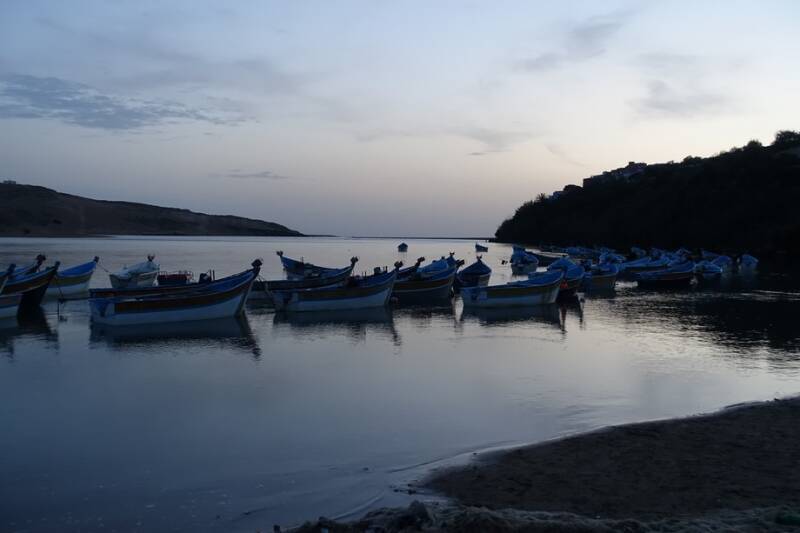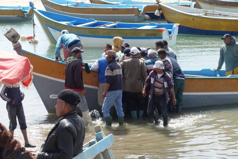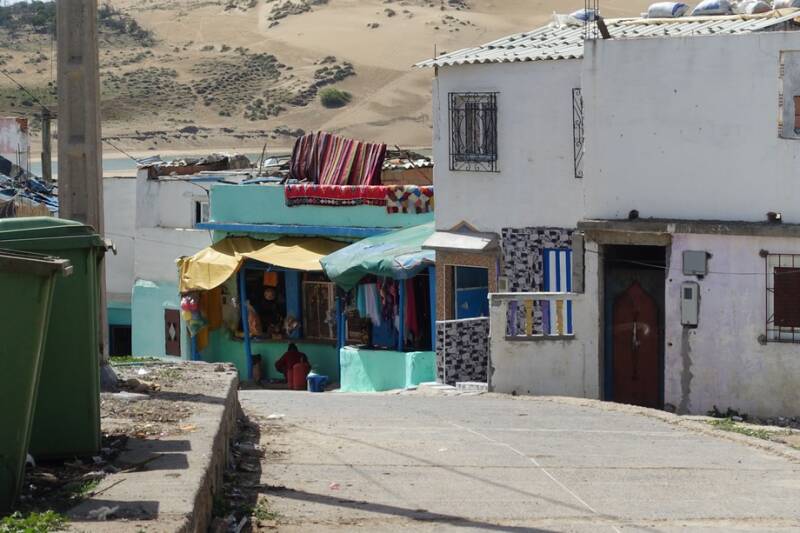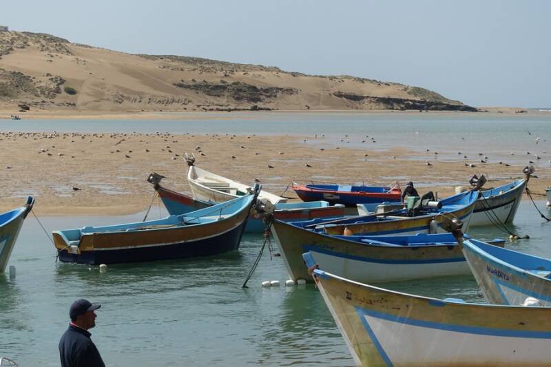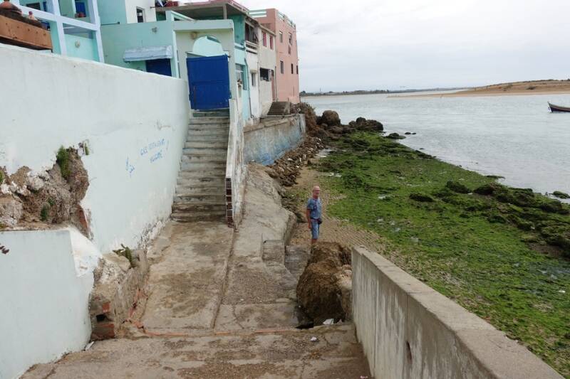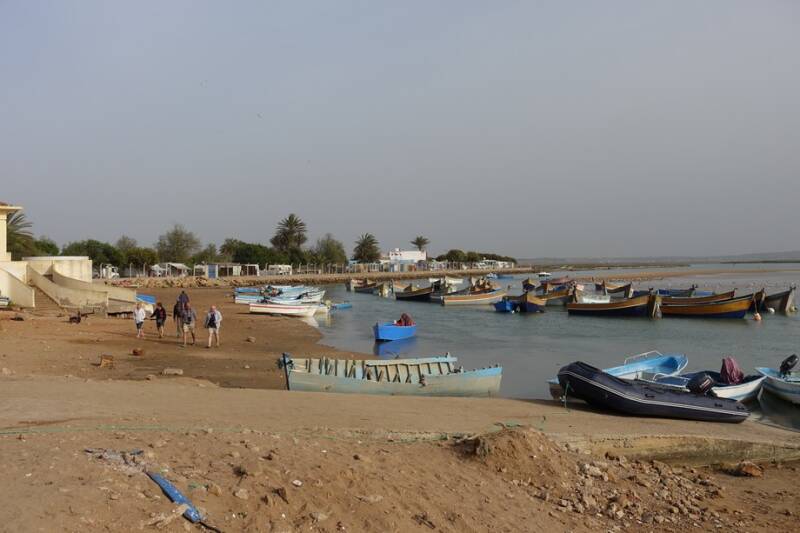 Gisteravond hadden we nog een regen- en onweersbui! Onweer hadden we nog nooit in Marokko gehad maar dat kan hier natuurlijk ook. Vannacht was er af en toe nog wat regen en vanmorgen was het weer droog. Eerst wat bewolkt maar om een uur of elf klaarde het op en zijn we naar het dorp gelopen. Dat moet je niet doen als het heel warm is want het is wel een stukje omhoog. Eenmaal boven gekomen heb je mooi uitzicht op de lagune met de vissersbootjes.