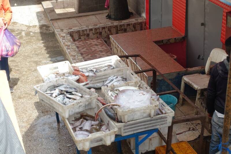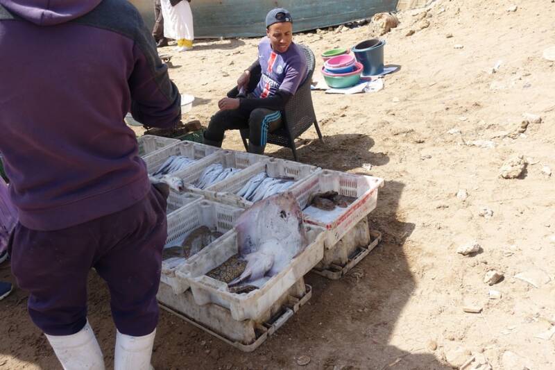 Hier was het een drukte van belang. Als er een bootje aankomt duikt iedereen erin om de vis er uit te halen. Dit gaat in kistjes en wordt meteen verkocht. Er worden veel verschillende soorten vis binnengehaald, o.a. platvis, dikke zeepaling, grote roggen, krabben, sardientjes en nog veel meer. Er wordt ook vis schoongemaakt, het afval wordt in het water gegooid en daar komen de meeuwen dan op af. We konden hier rustig tussendoorlopen en foto’s maken. Ik kreeg ook een zakje aangeboden om met vis te vullen bij de boot, dit aanbod heb ik vriendelijk afgeslagen. Kijken was genoeg!