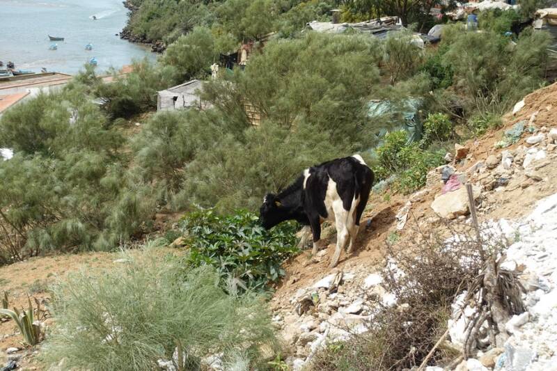Onderweg terug naar de camping liep er een koe langs het pad. Even later liep de koe een stukje de helling af, net als een geit, en begon heerlijk van een grote plant te eten. Dat kan alleen hier, een klimkoe.