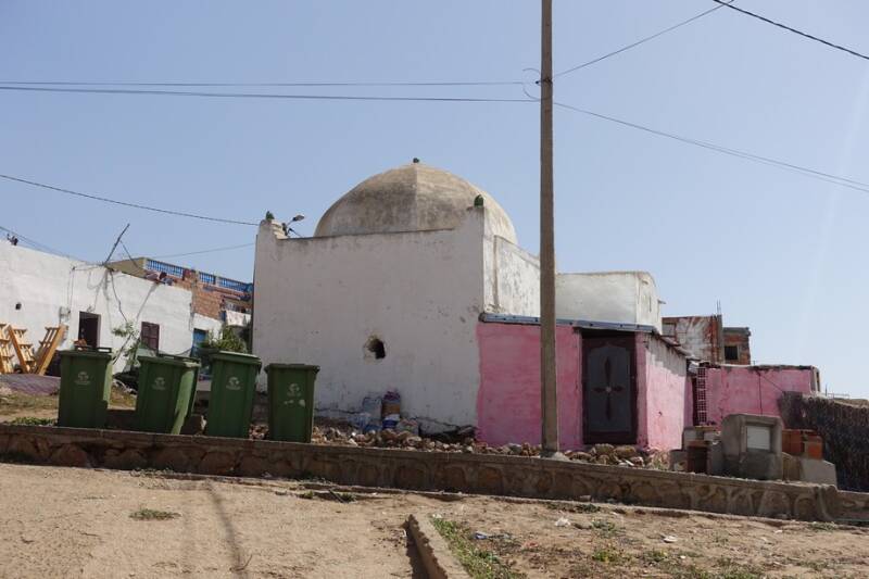 Op het weggetje van het strand omhoog kwamen we een hele grote ficus tegen, bij ons thuis doen ze het alleen binnenshuis! In hetzelfde buurtje staat de maraboet die bewoond leek en er is ook een klein winkeltje. De hoofdstraat met al zijn restaurantjes ziet er weer heel anders uit.