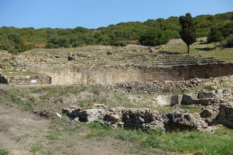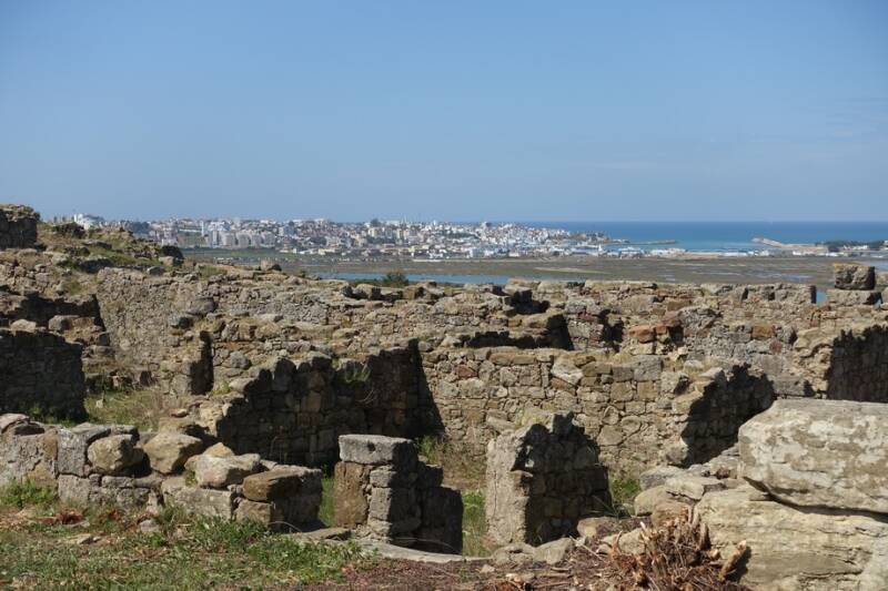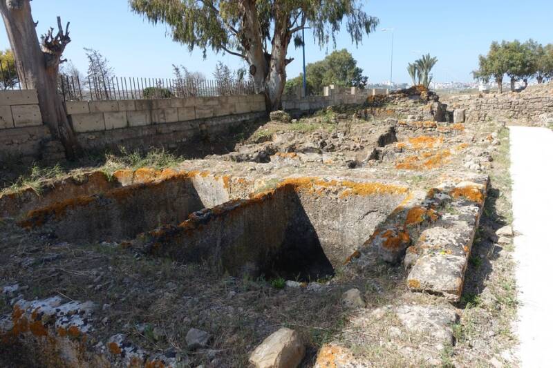 Het was een interessante rondleiding, de gids was zelf archeoloog en wist veel te vertellen. We kwamen langs de restanten van een visverwerkingsfabriek, een cysterne( drinkwateropslagplaats), een Romeins theater waar ook mens tegen leeuw gevechten werden gehouden, Romeinse baden, een tempel, een paleis en een moskee met ondergrondse wasplaats voor de traditionele reiniging.