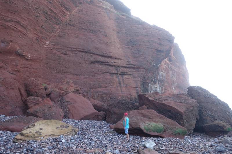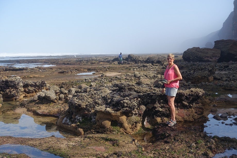 Zo gezegd zo gedaan, na de koffie zijn we naar de rotsen gelopen. Het was laag water en dan kun je best ver komen. Er waren ook wat vissers op zoek naar inktvissen in de poeltjes tussen de stenen. Bij laag water kun je ook goed zien dat er veel mosselen groeien. De rode rotswand waar we onder langs liepen was wel heel imposant. Op een gegeven moment liepen de vissers terug richting dorp. Blijkbaar kwam het water weer op dus zijn we ook maar gauw teruggegaan want je wilt niet vast komen te zitten op een rots, voor een uurtje of zes.