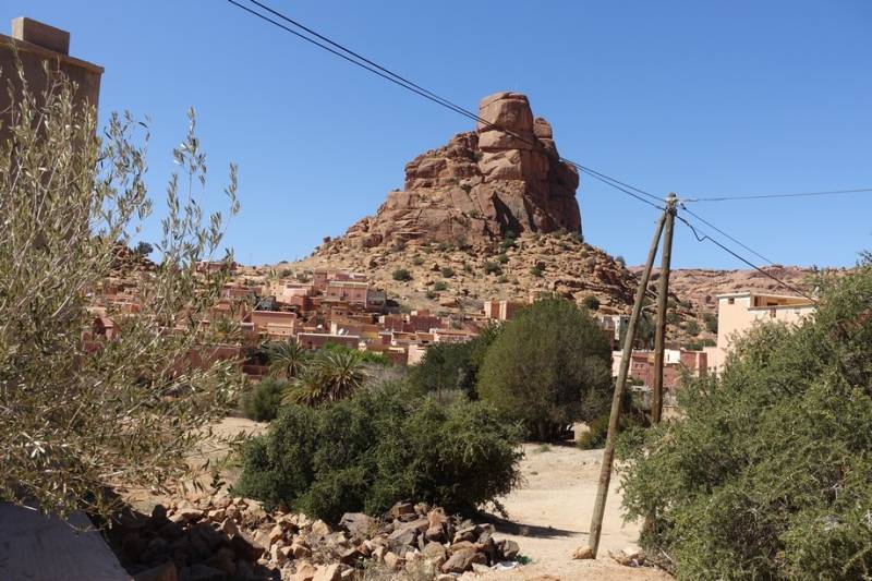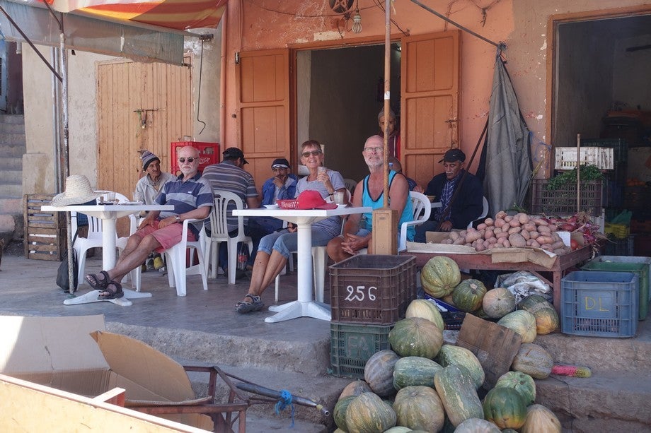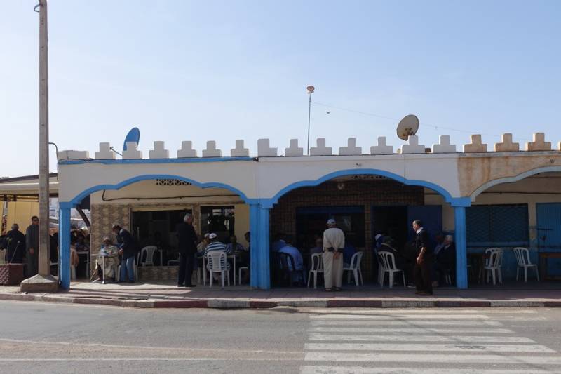Om twee uur kwamen we in Tafraoute en hadden we honger. In het dorp hebben we op een klein terrasje naast de groenteboer een soort linzensoep met kip en brood gegeten. De koffie kwam van de overkant. Het was erg lekker en we moesten 40 dirham betalen.(€ 4)