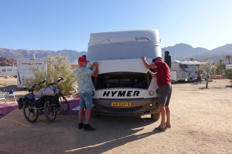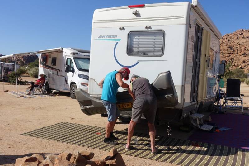 Tegen de avond kwam Mohammed, van de garage, nog langs. Gerard wil zijn achterbumper over laten spuiten want die is lelijk. Morgen sleutelen de mannen hem eraf en gaat de bumper naar de garage. We zijn benieuwd.