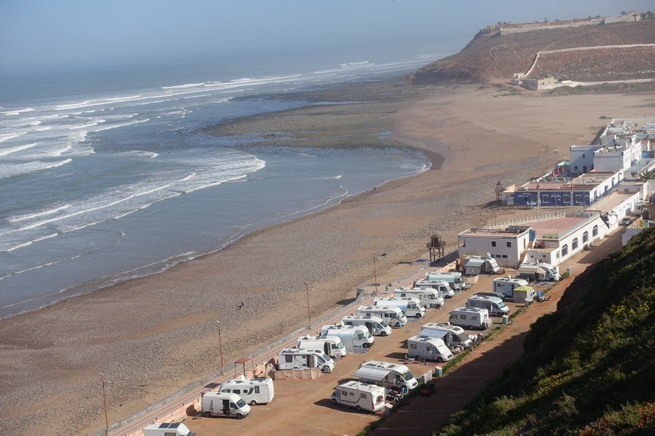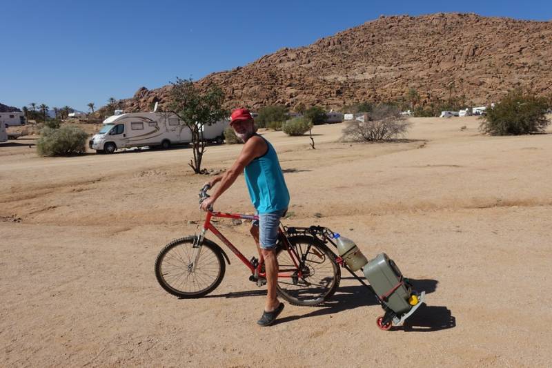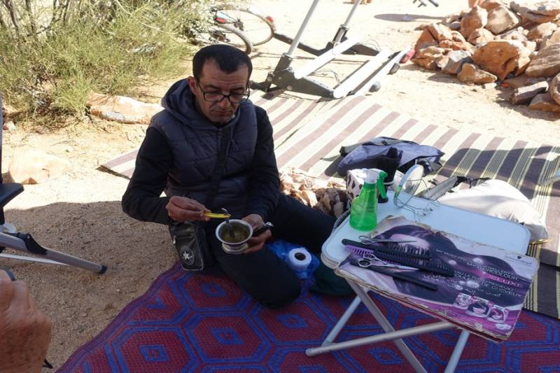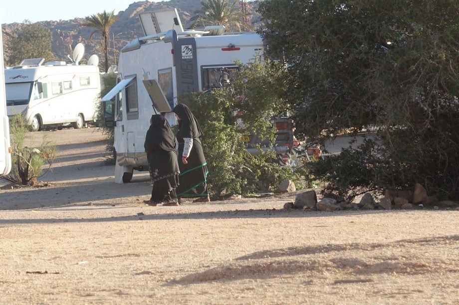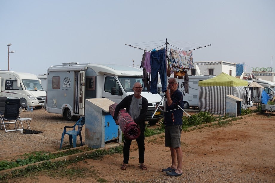 Vanmiddag lekker in de zon gezeten. Om vijf uur zijn we naar de hammam gefietst. We hadden gehoord dat je daar ook kunt douchen en dat scheelt weer afvalwater. Ik, Wil, maakte de fout naar de vrouwenafdeling te gaan. Daar is alleen hammam, geen douche maar dat wist ik niet, nu wel. Het was wel gezellig tussen de Marokkaanse vrouwen, maar niet helemaal wat ik bedoelde. Jezelf wassen met twee emmers lauw water en een pannetje om te spoelen, zittend op een laag krukje met drie poten. Volgende keer ga ik gewoon met Cor mee. Op de mannenkant zijn tien mooie douchecabines.