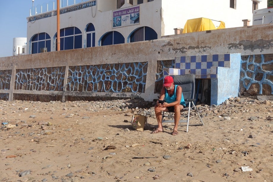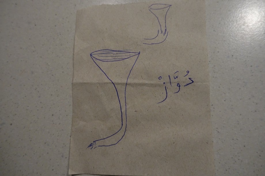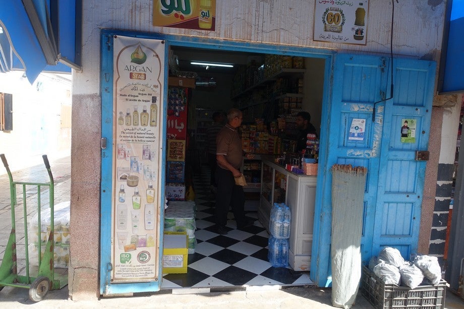 We zochten een trechter met een schuine tuit om met een jerrycan water te kunnen vullen. We kwamen in een klein winkeltje terecht maar de winkelier had er helaas geen. Hij snapte ons wel en legde ons uit waar we een trechter zouden kunnen kopen en hoe we die dan met een slang passend zouden kunnen krijgen. Hij nam alle tijd voor ons ook al kochten we niets bij hem, service! Dat komen we hier heel veel tegen en we weten nu hoe we “trechter”in het Arabisch moeten schrijven!