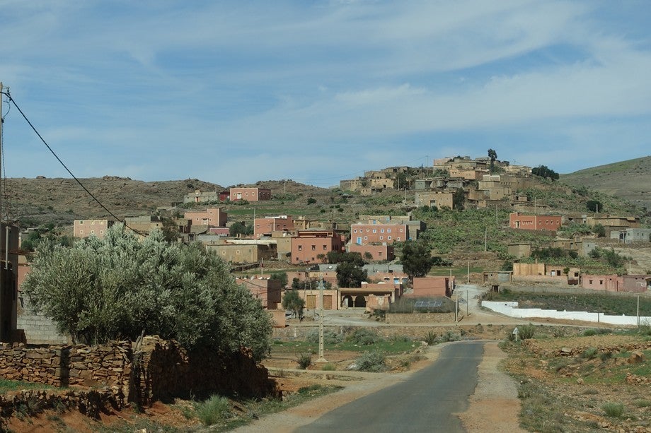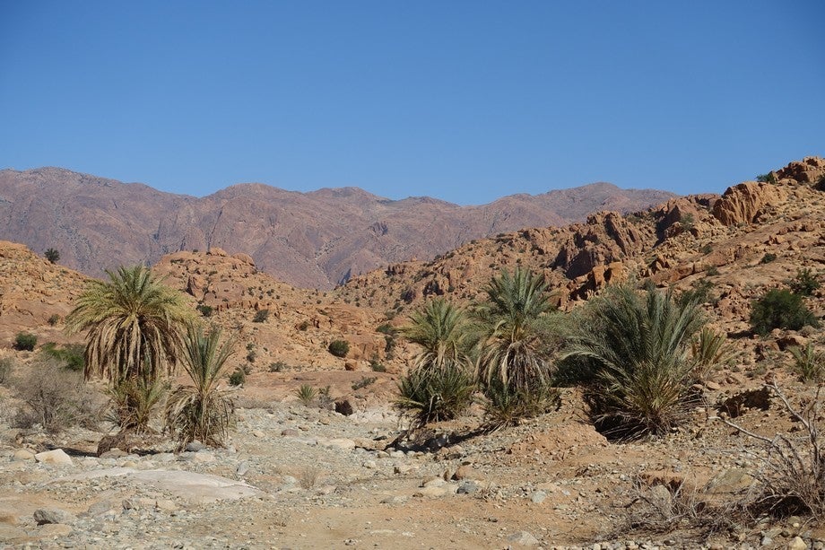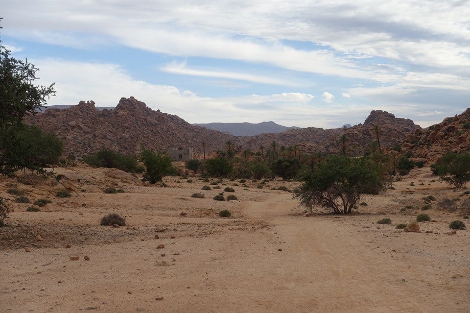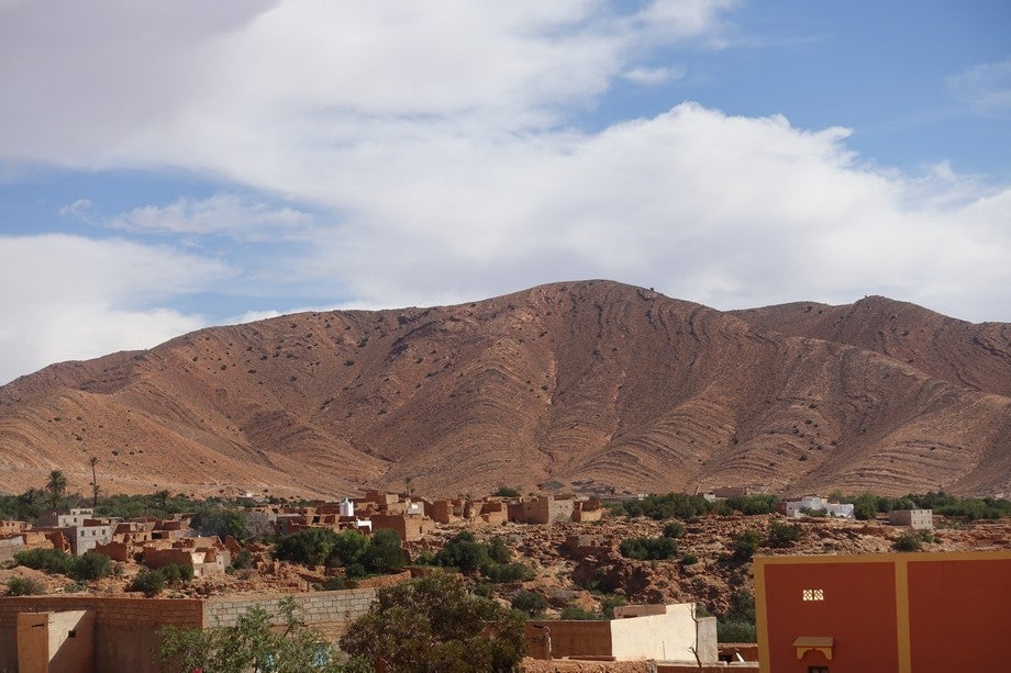 Om negen uur kwam de zon over de berg. Hier koelt het ’s nachts wel af, Tafraoute ligt op 1000 meter hoogte.