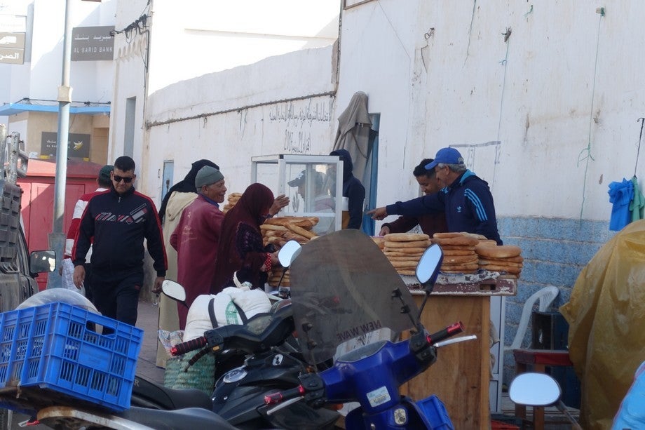 Langs een moskee en door een straatje met winkeltjes, o.a. een bakker en een drogist weer terug naar de dagelijkse markt.