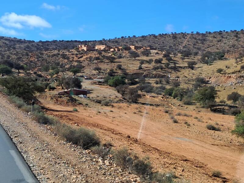 Vandaag hadden we een mooie rit. Het eerste deel naar Tiznit, waar we nog boodschappen hebben gedaan, is nog vlak maar daar voorbij richting Bouizarkane kom je in de bergen. We reden op een goede weg met nieuw asfalt. Boven op een pas was een goede plek om te lunchen en daar was het koud. Eenmaal over de pas en weer naar beneden ligt dan Bouizarkane. De campig ligt een stukje voor het dorp maar we zijn eerst doorgereden naar de groenteboer voor groente en fruit. Naast de groentekraam was de slager, daar zou ik even gehakt halen. Aan het vlees te zien had de man rundvlees. Toen ik stond te wachten begon de koeienkop naast me te schommelen in de wind en ben ik maar gauw weggelopen. Dat ging me net iets te ver!