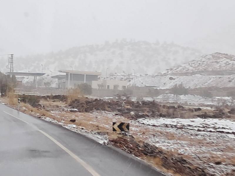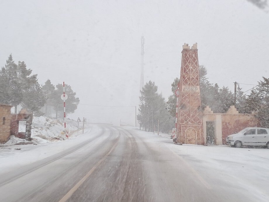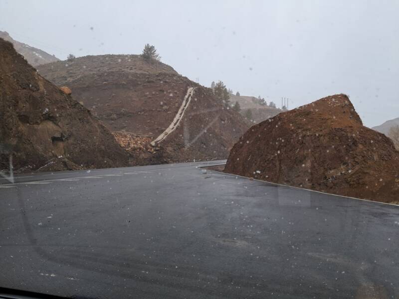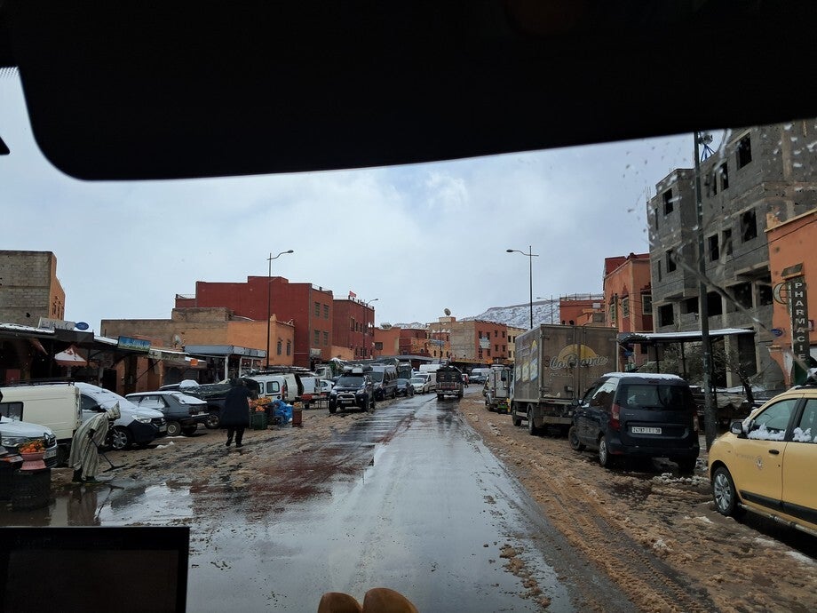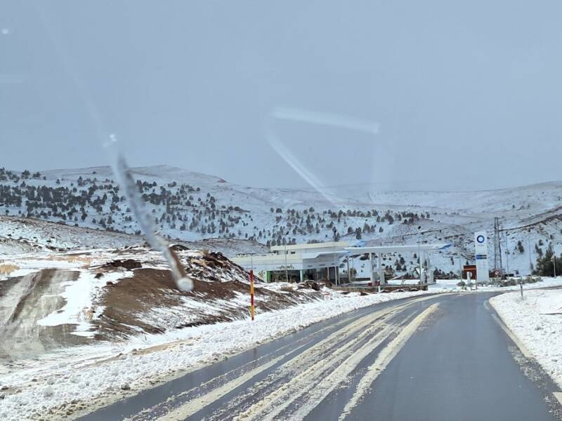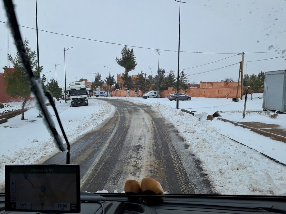 Bij het eerste dorp was de slagboom naar beneden en stond al een hele file, voornamelijk vrachtwagens. Wij konden rustig doorrijden en de sneeuw werd geleidelijk minder. Bij de derde slagboom was het een chaos. Hier lag geen sneeuw en de mensen wilden doorrijden maar werden tegen gehouden door de politie. Gelukkig konden wij gewoon door rijden tot de afslag naar de N10 richting Agadir. Door een mooi zwart\bruin berglandschap met nog een heuse bergpas van 1700 meter hoog ( zonder sneeuw) zijn we naar Tazenakt gereden. Iets ten zuiden daarvan staan we op een “camping” bij een restaurantje bij te komen van dit angstige avontuur.