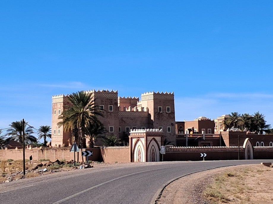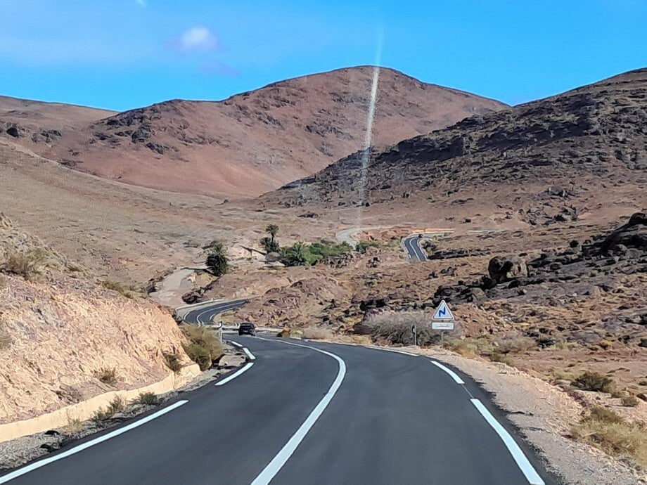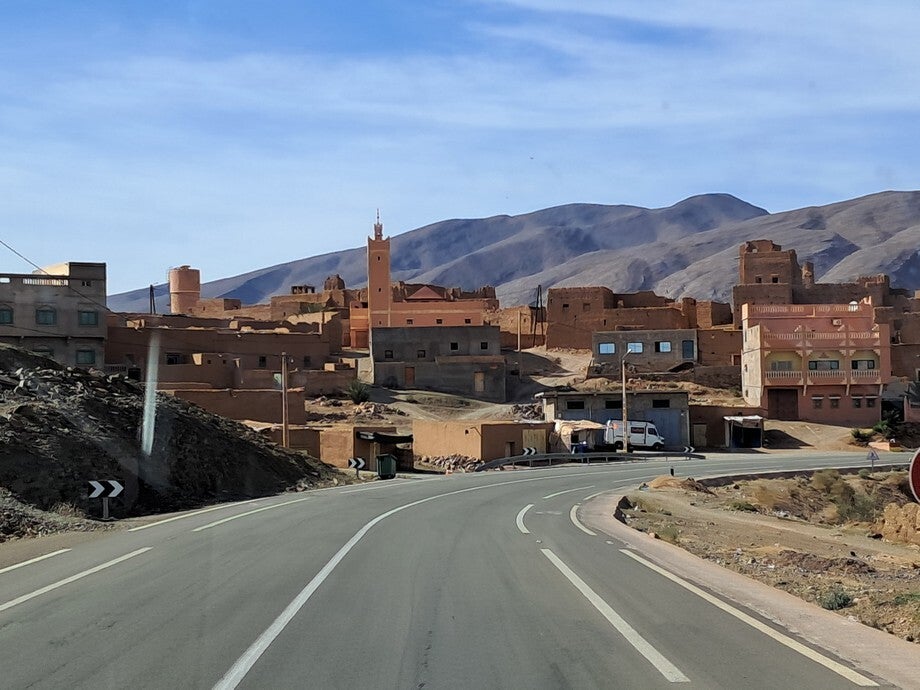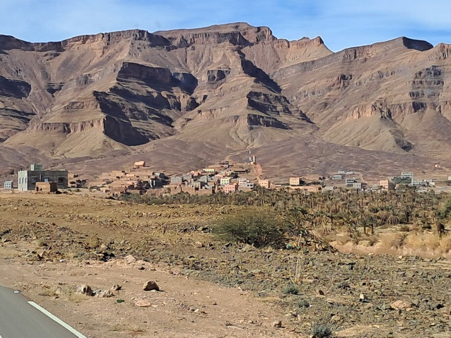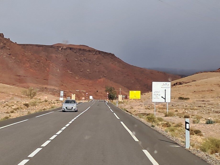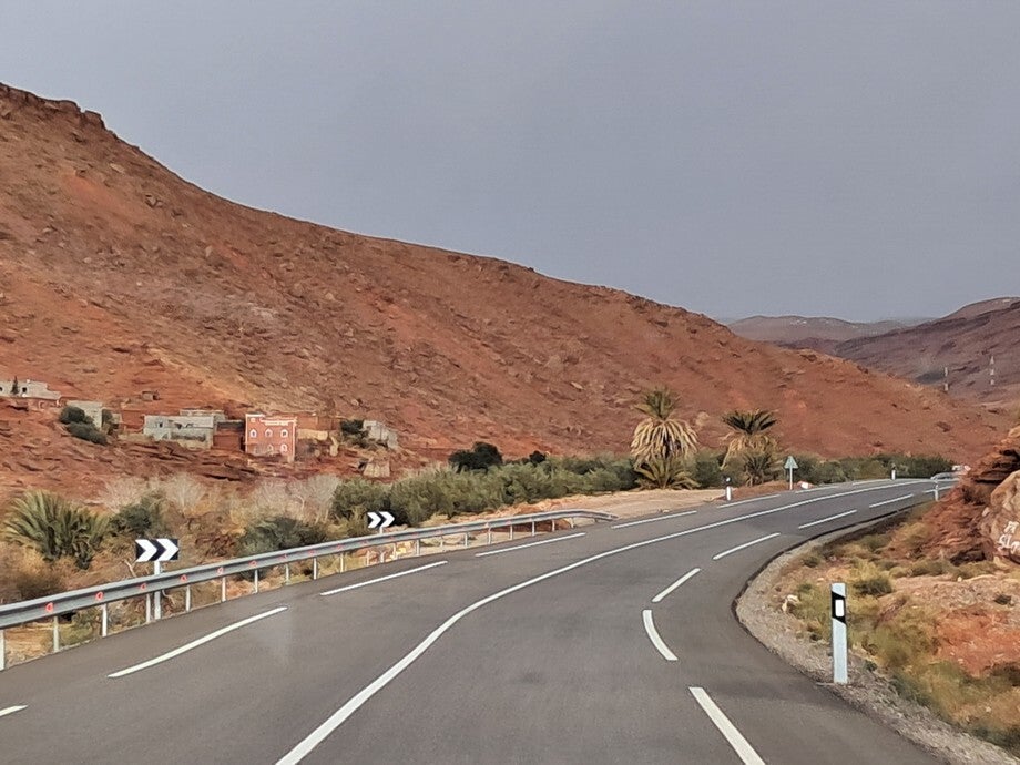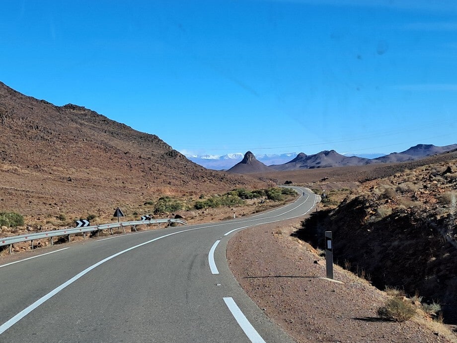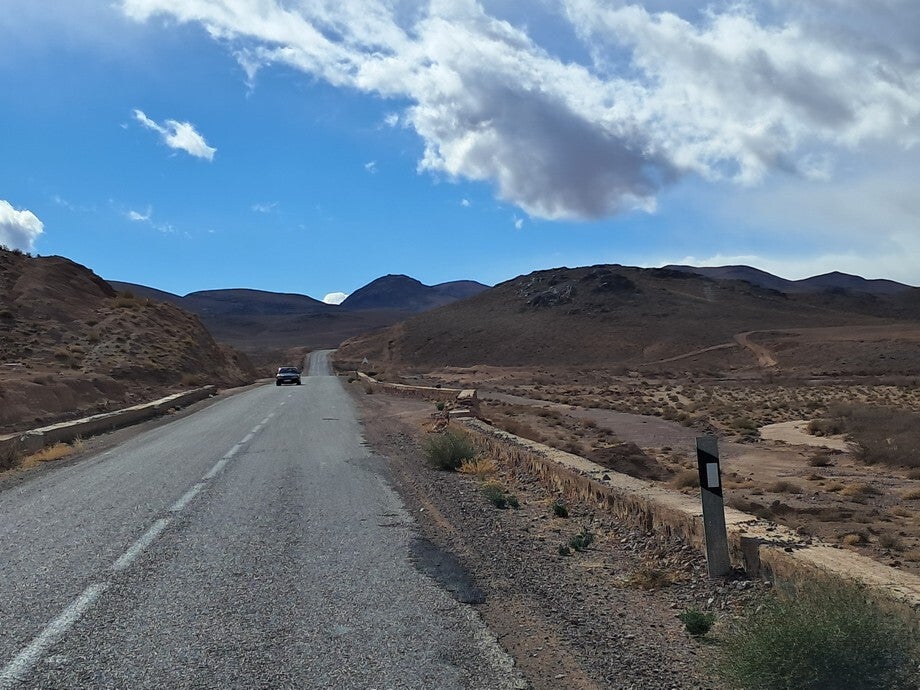 De foto’s zijn onderweg gemaakt, verschillende landschappen en verschillende kwaliteiten asfalt. De foto op het onverharde weggetje was een koffie stopje hoor, geen doorgaande route. De paardenkar was in Rissani, die kwam plotseling van links en dacht dat hij voorrang had.