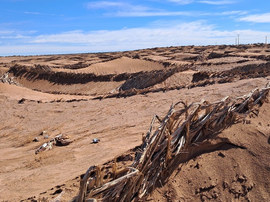 Langs de doorgaande weg rukt het zand ook op. Hier zijn een soort windschermen aangelegd en daar omheen vormen zich zandduintjes zodat de weg schoon blijft. Er staan veel grote hotels langs deze weg. Na 8 kilometer, bij het volgende dorpje, vonden we een zonnig terrasje om lekker te lunchen.