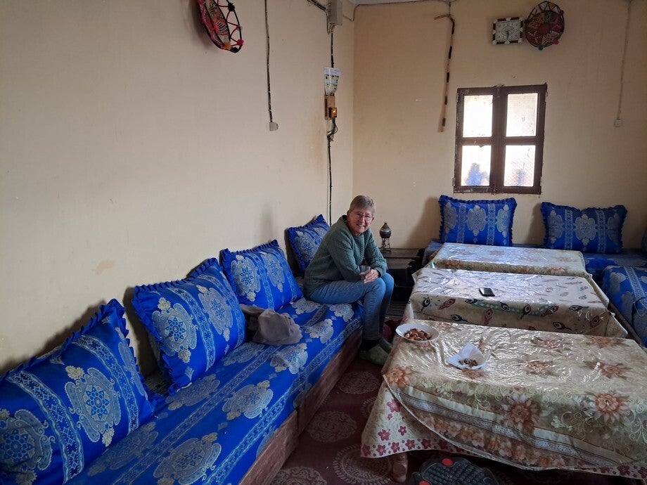 We staan nu op camping El Khaima waar we acht jaar geleden ook hebben gestaan toen met het nomadenfestival. De laatste 30 kilometer hier naartoe regende het wat en dan is het meteen prut overal. Om half vier werd het droog en konden we eerst wat modder scheppen en het tapijt neerleggen.