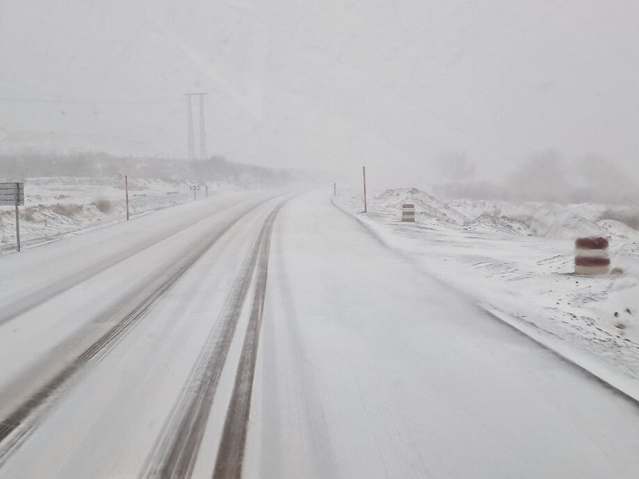 Onderweg betrok de lucht en tijdens de koffiestop was er een beetje natte sneeuw. We zijn maar doorgereden maar naarmate de weg steeg werd de sneeuw gaandeweg een beetje meer. We zijn drie keer een slagboom gepasseerd en die waren alle drie open. Na het laatste dorp werd het wel wat serieuzer maar alles reed door en het was nog wel te doen. Er kwamen ook steeds nog tegenliggers. Ineens begon het ook hard te waaien en was de weg helemaal bedekt met sneeuw. Iedereen reed langzaam door dus wij ook maar. Tot plotseling de auto vóór ons stopte. Toen moesten wij ook wel stoppen. De voorganger reed weer door maar wij konden niet meer wegkomen. Omdat het spoor in het midden van de weg was, gingen er een paar auto’s links en rechts voorbij. Ze gingen wel voorzichtig. Toen er niets meer aankwam zijn we voorzichtig een stukje achteruit naar de kant gereden, dat ging wel.