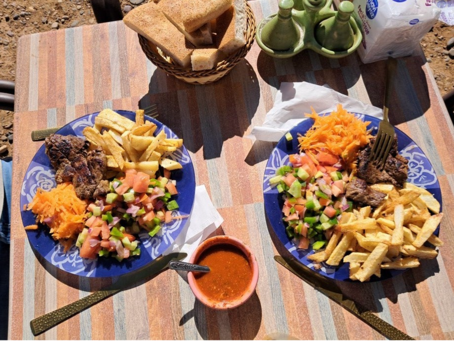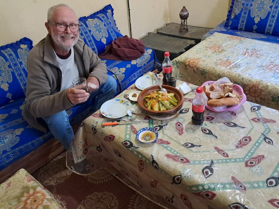 We hadden geen zin meer om te koken en hebben ons maar laten verwennen met salade, tajine en sinaasappel. Natuurlijk eerst thee met dadels. Voor de camping + eten moesten we 250 dirham, € 25, afrekenen. Hij probeerde nog voorzichtig een tapijtje te slijten maar dat hoefden we niet en gelukkig drong hij niet aan maar was wel heel aardig.