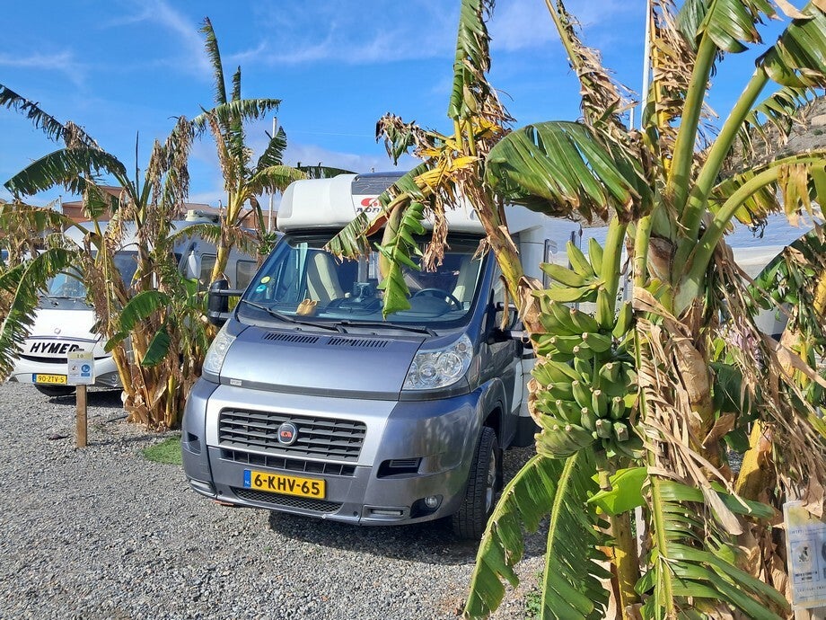 Zondag zijn we naar Torre Nueva gereden naar de cp, daar hadden we op de heenweg ook gestaan. G en M gingen ook mee. We hadden allebei nog een mooi plaatsje naast de bananenbomen waar deze keer kleine banaantjes aan hingen! Het was mooi weer, alleen winderig, dus zijn we nog een keer naar boven naar de hangbrug gelopen voor het mooie uitzicht. Later onder het genot van een drankje hebben we gezellig bij gekletst. G en M wilden eigenlijk ook naar Marokko maar door allerlei kleine tegenslagen hebben ze besloten in Spanje te blijven.