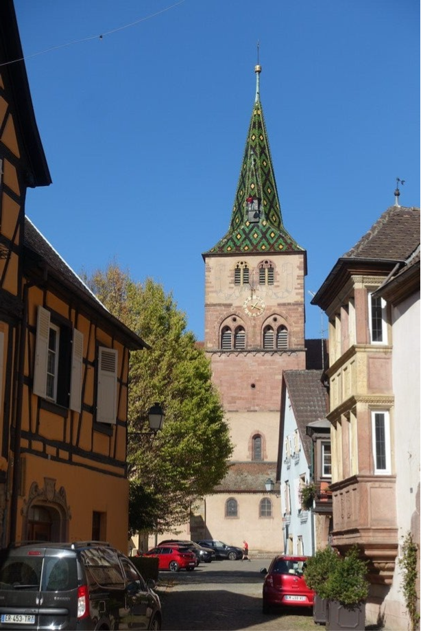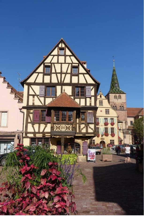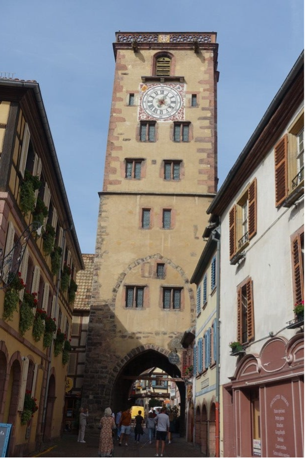 Nog maar een fietstochtje gedaan, er zijn hier zoveel leuke stadjes. Vandaag was ons doel Turckheim. Weer een toren met poort als ingang. Boven op de toren is een ooievaarsnest gebouwd. Als je er op let zie je er wel meer hier en daar. In het centrum viel de mooie torenspits van de kerk wel op, ook de vele bloemen overal.