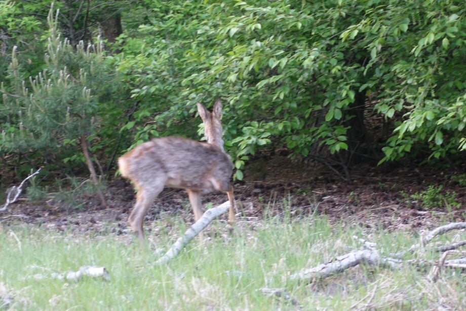 Gisteren was het bewolkt en af en toe een beetje regenachtig. ’s Morgens hebben we nog een rondje langs de paarden gelopen. ’s Middags was er af en toe een bui dus lekker gelezen en gepuzzeld. Konden we een beetje uitrusten van al dat gefiets! ’s Avonds was het droog dus nog een rondje om de camping gelopen. Daar kwamen we bijna op dezelfde plek als vorige week twee hertjes tegen. Ze wilden niet poseren dus met veel inzoomen kreeg ik er één op de foto. Hij is een beetje wazig geworden maar wel herkenbaar.