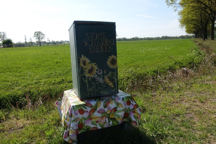We zijn over Groenlo terug gefietst, daar hebben we nog brood gekocht want in de buurt van de camping is geen supermarkt. Die is 6 kilometer verderop in Eibergen. Maar langs de weg kun je ook van alles kopen. Ook nog maar even verse eitjes en jam meegenomen uit deze mooie koelkast.