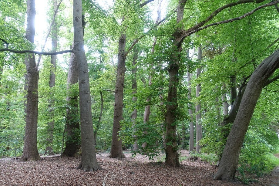 Er zijn veel bomen gemarkeerd met een rode rand, blijkbaar moet het bos nog flink uitgedund worden. Op andere plaatsen is het mooi lentegroen.