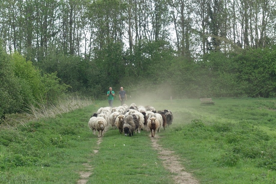 Aan de andere kant werden we achtervolgd door een kudde schapen die naar een andere weide moesten. Eerst liepen ze de verkeerde kant op want er was iemand met een hondje maar na wat opjagen en roepen van de herders gingen ze de goede kant op.