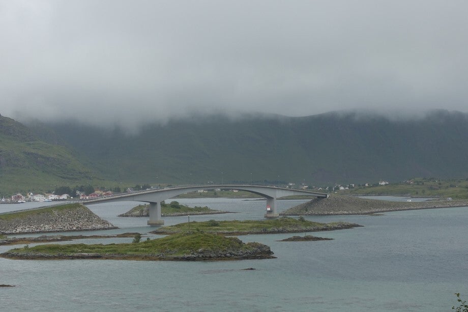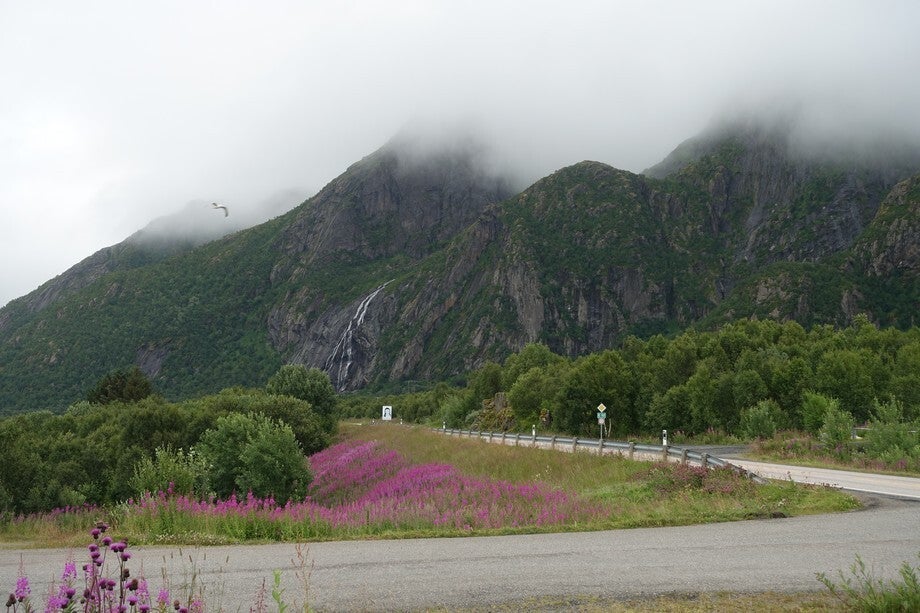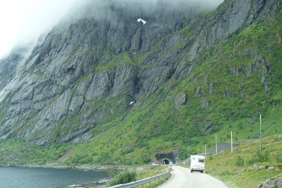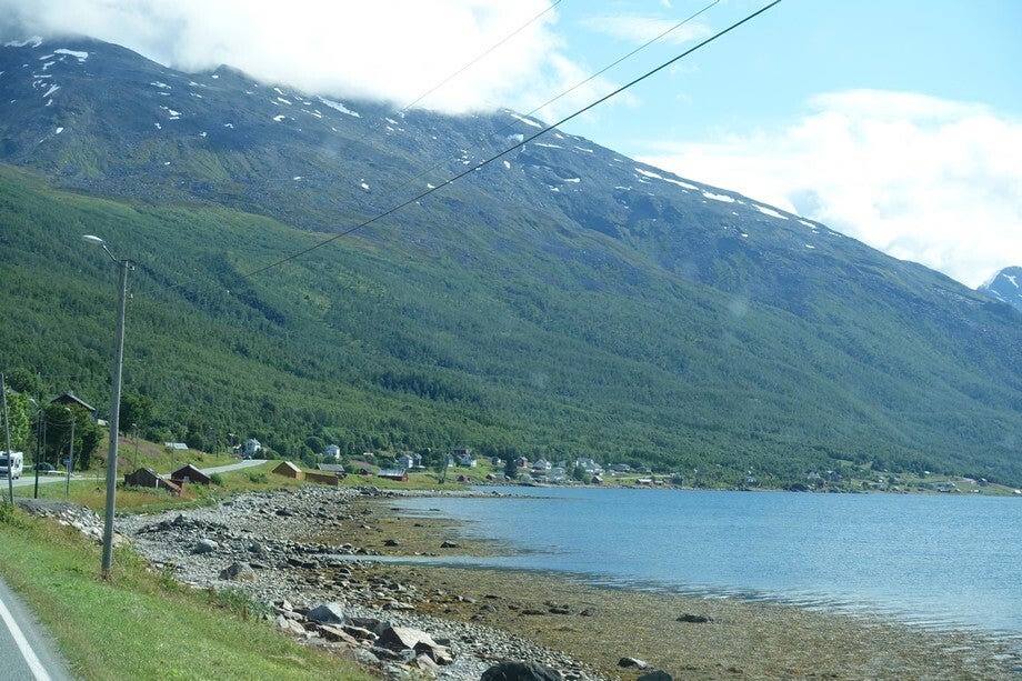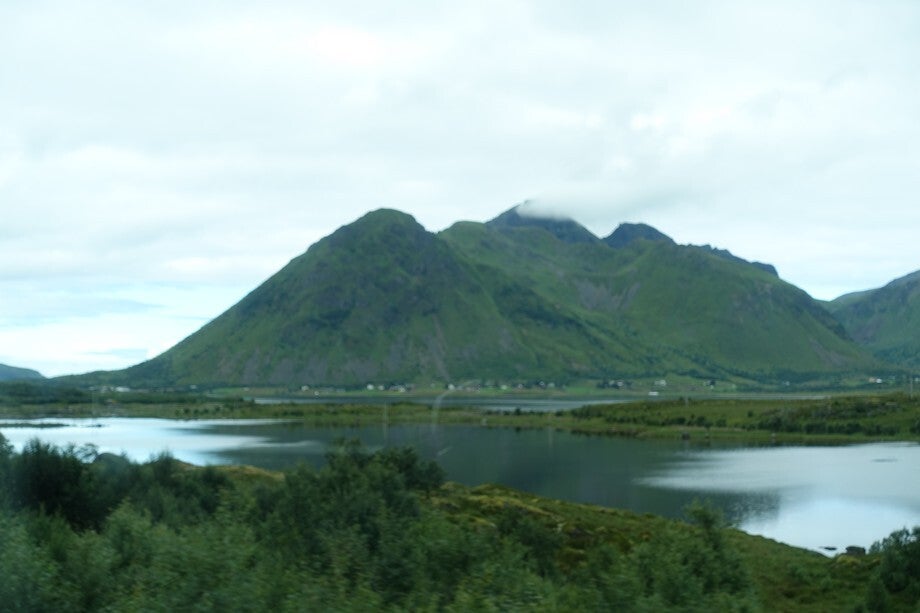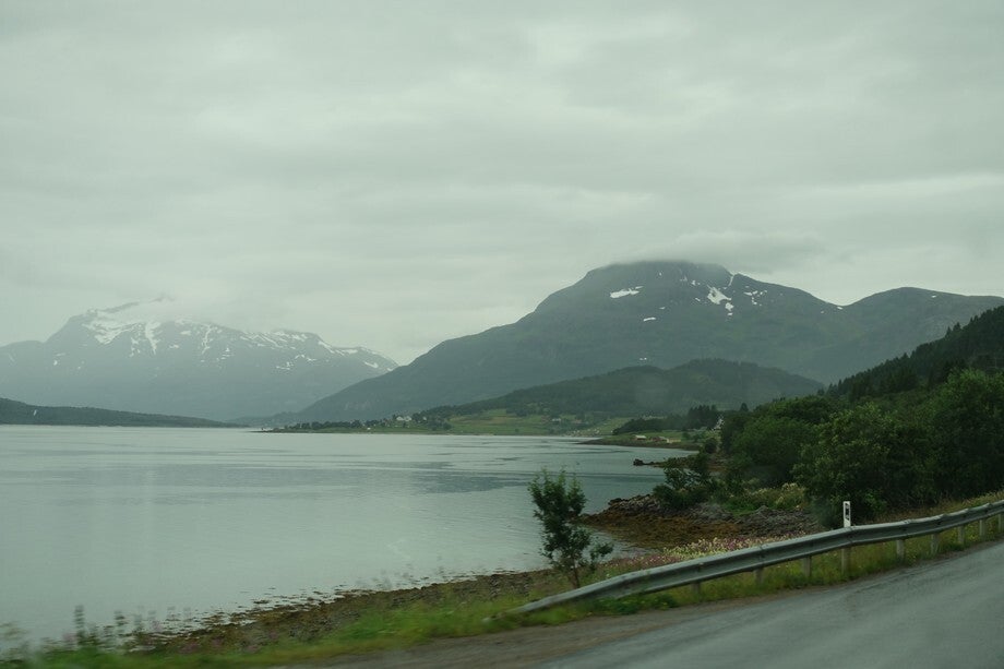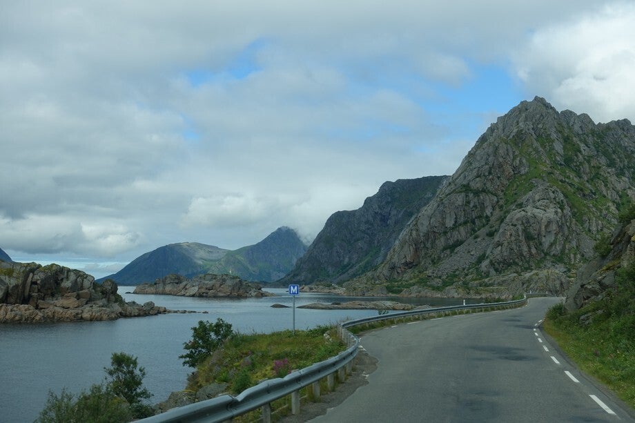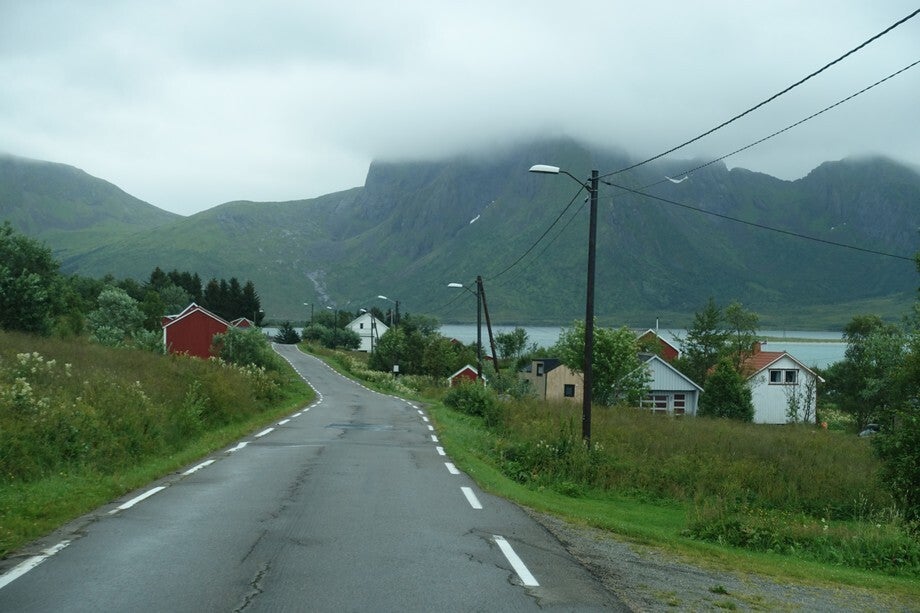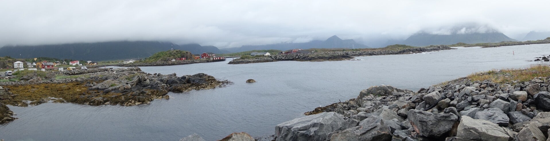 De route ging daarna over de bergen naar de andere kant van het eiland. Boven was het mistig, winderig en koud, met af en toe een regenbui. Toch was het wel mooi rijden. Bij Fiskebol zijn we van de E10 afgeslagen de kustweg op. Deze is niet heel breed, één-baan met genoeg uitwijkplaatsen. Het asfalt is goed, dus goed te doen. Hij loopt mooi langs enkele fjorden, met af en toe een dorpje en mooie strandjes.