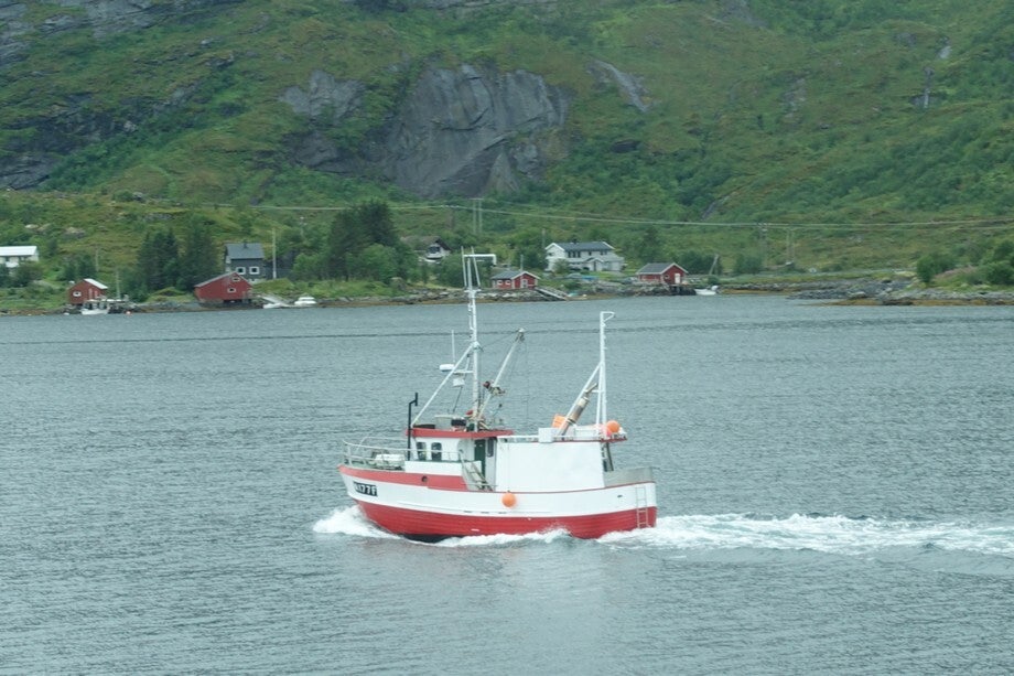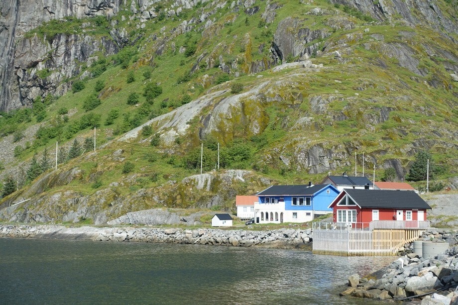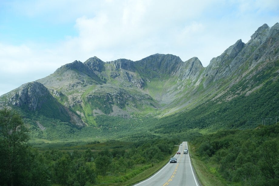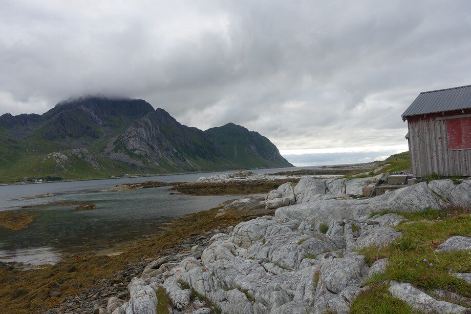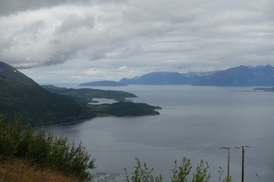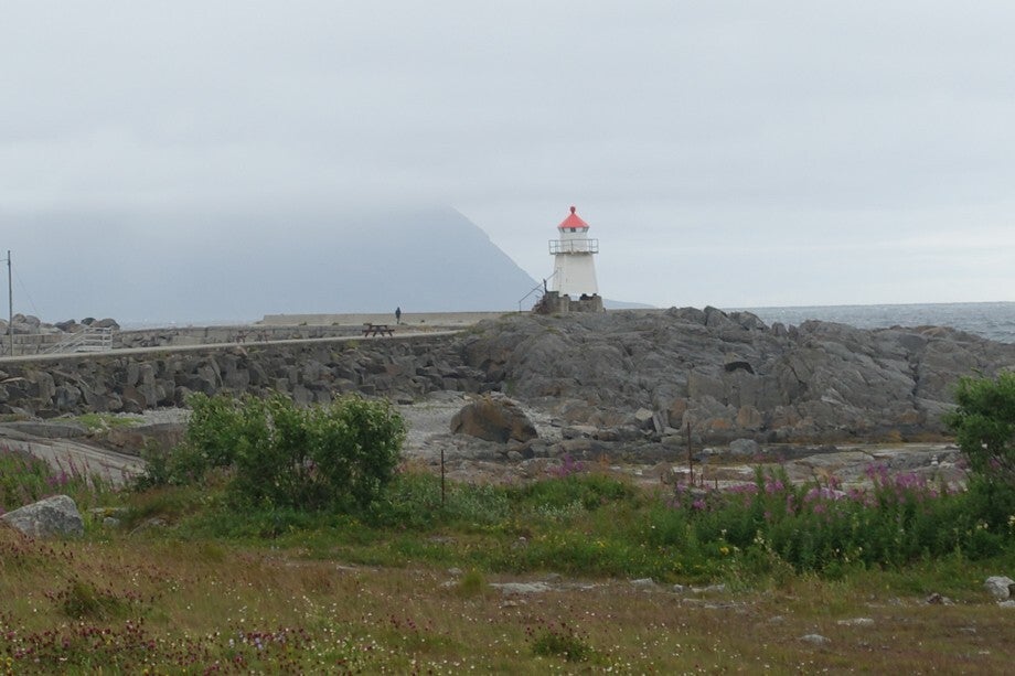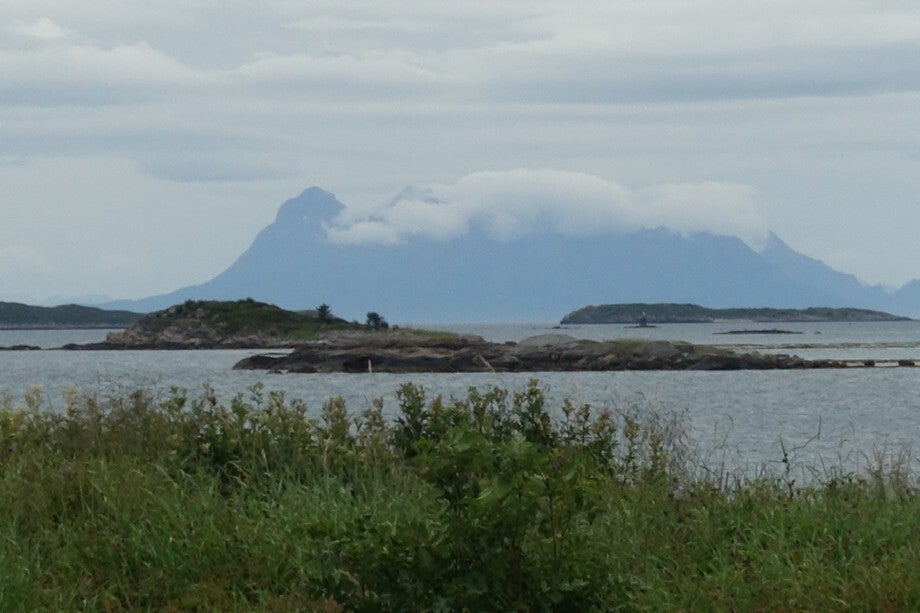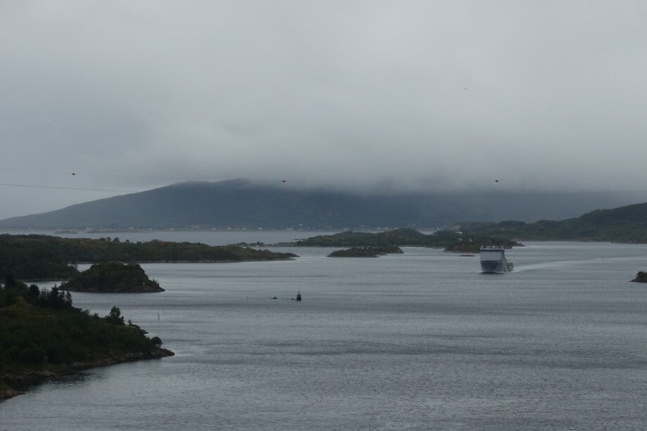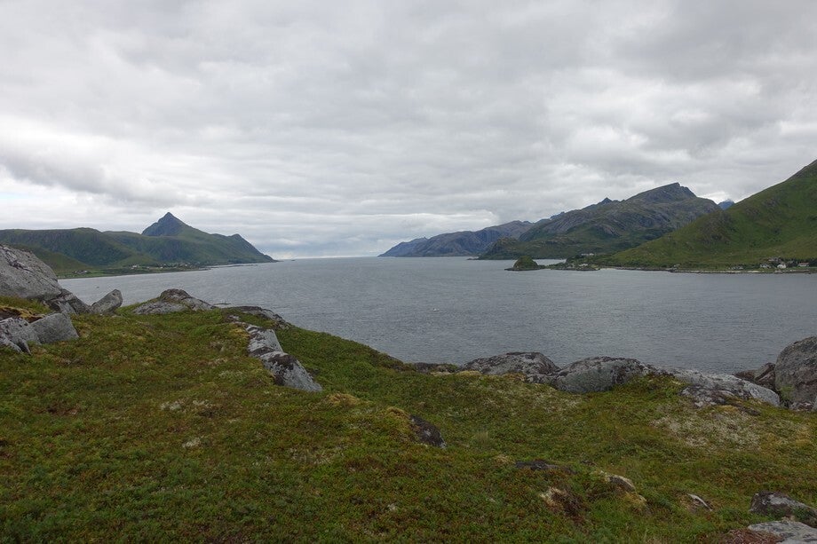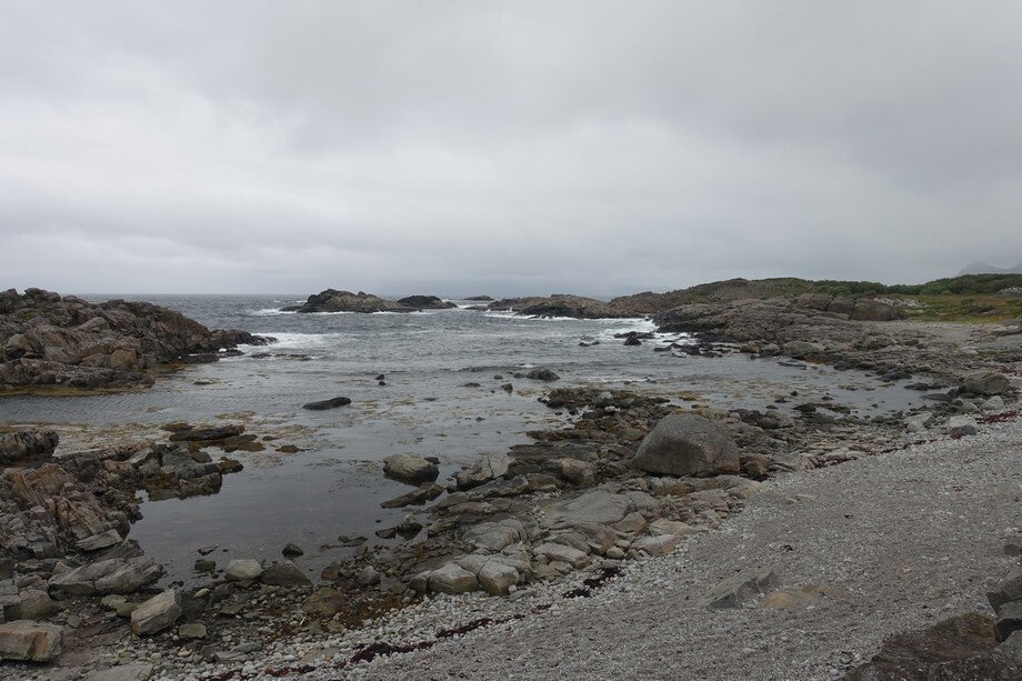 De route ging daarna over de bergen naar de andere kant van het eiland. Boven was het mistig, winderig en koud, met af en toe een regenbui. Toch was het wel mooi rijden. Bij Fiskebol zijn we van de E10 afgeslagen de kustweg op. Deze is niet heel breed, één-baan met genoeg uitwijkplaatsen. Het asfalt is goed, dus goed te doen. Hij loopt mooi langs enkele fjorden, met af en toe een dorpje en mooie strandjes.