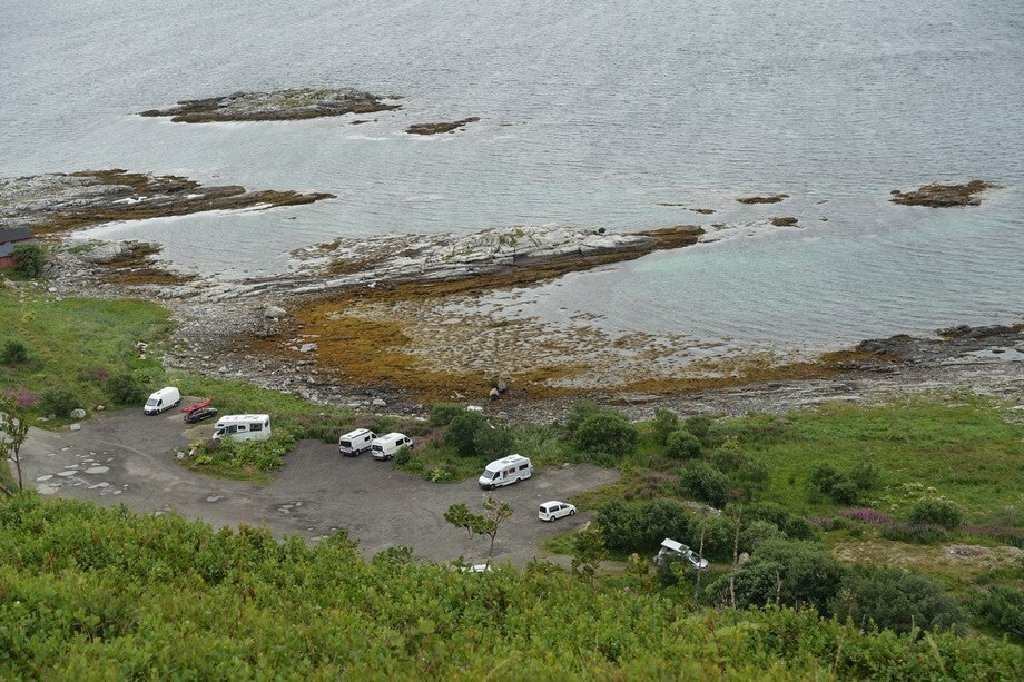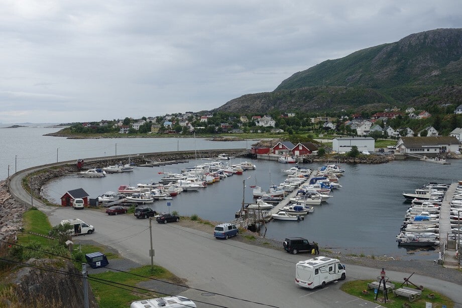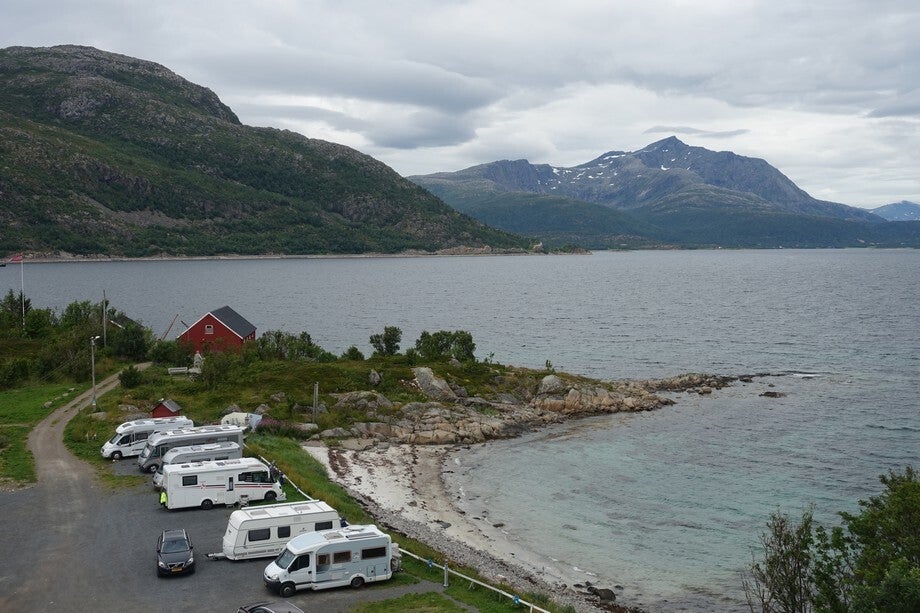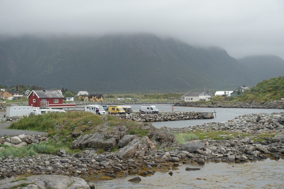 De parkeerplaatsen waar je volgens campercontact kon staan waren afgezet met een ketting of rotsblokken. Vanwege het gure weer wilden we eigenlijk toch aan de stroom en we vonden een mooie cp met alle voorzieningen bij Laukvik. Hier eindigt de weg, morgen moeten we eerst een stukje terug.