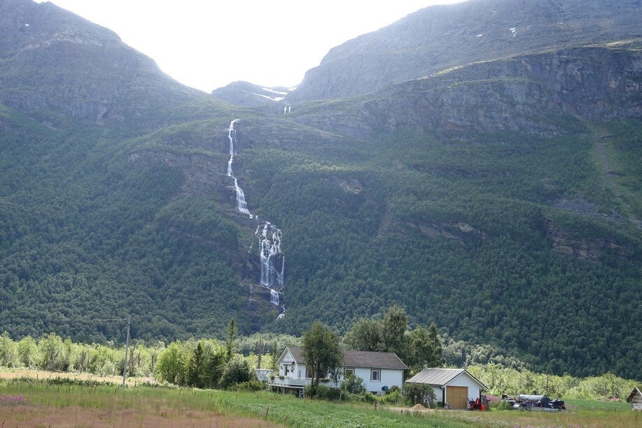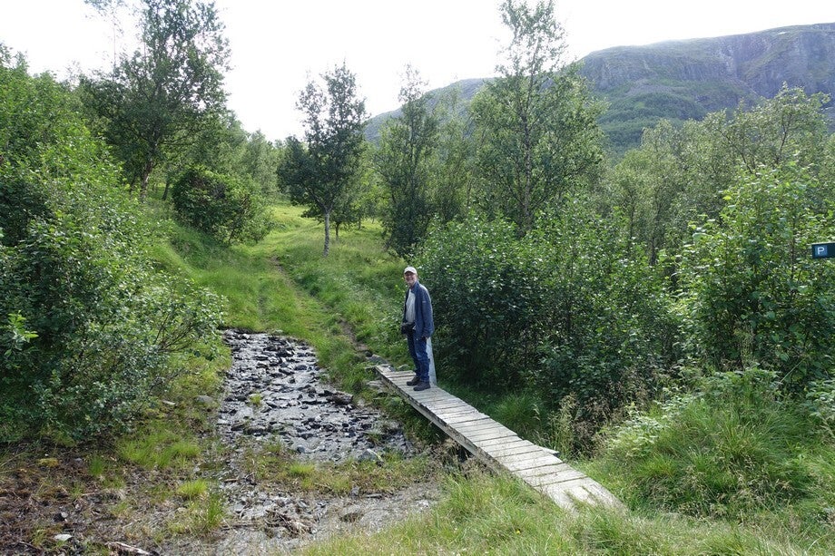 Bij Birtavarre zijn we een zijweg ingeslagen het dal in. Eerst waren er nog wat dorpjes en een asfaltweg. Die stopte bij de P waar de langlaufpiste ’s winters begint. Nog twee en een halve kilometer hobbelen en dan is er een wandelparkeerplaats. Hier beginnen een paar wandelroutes. We wilden naar een kloof lopen. Helaas was de voetgangersbrug over de rivier weggeslagen. Toen zijn we langs de weg gaan lopen en over een ander wandelpad. Was ook erg mooi. Helaas stopte ook dat pad bij een kapotte brug.
