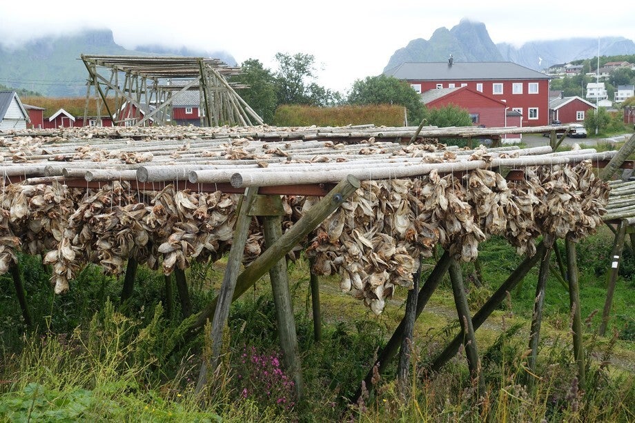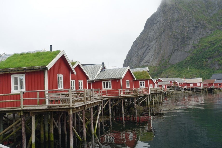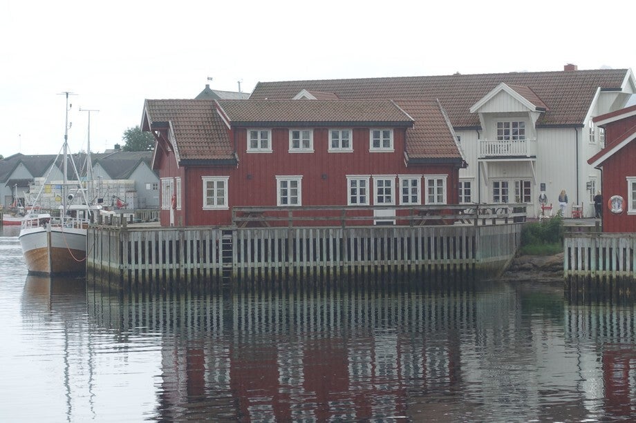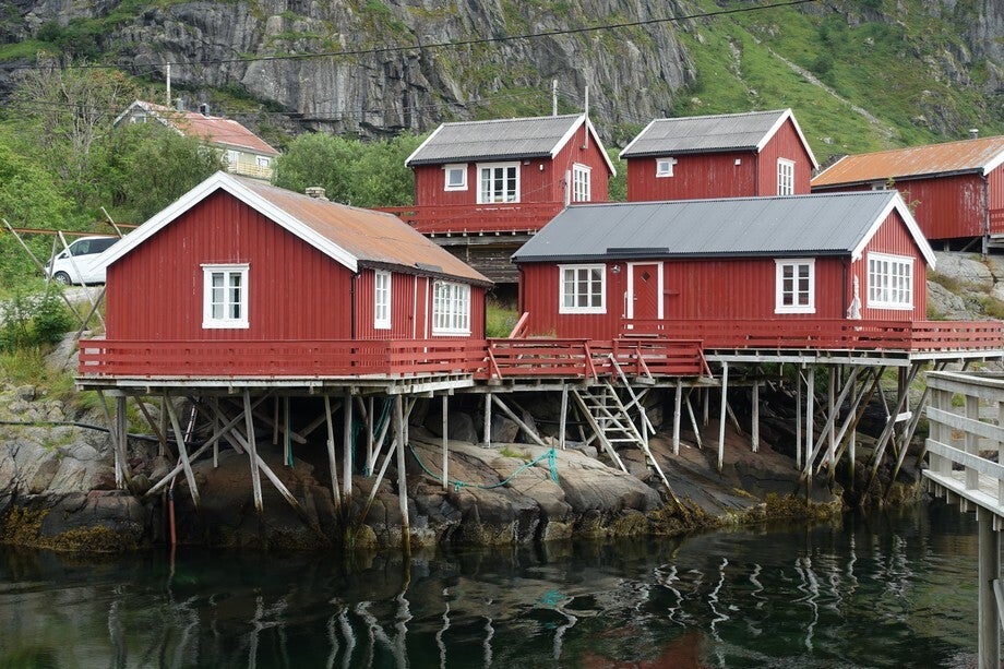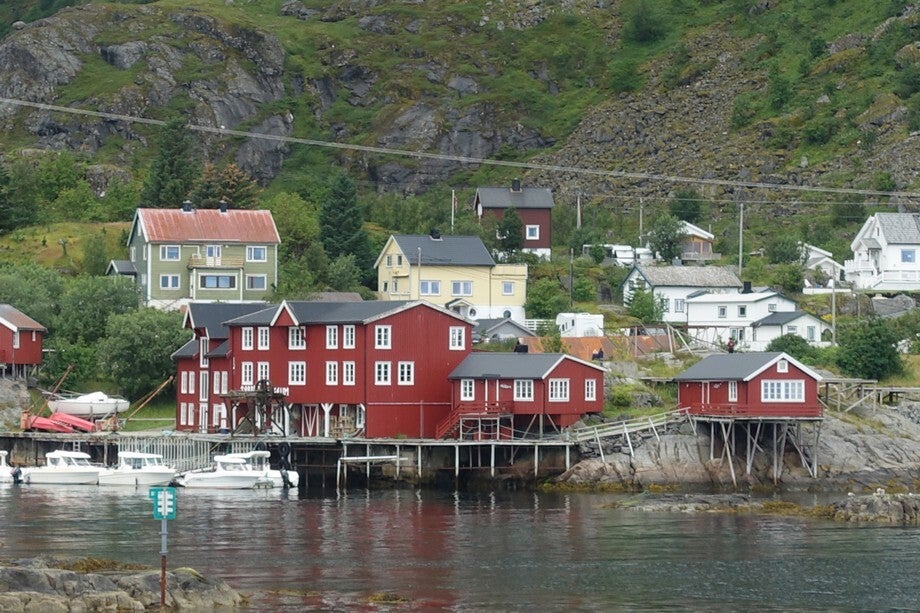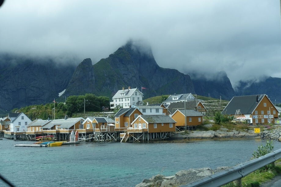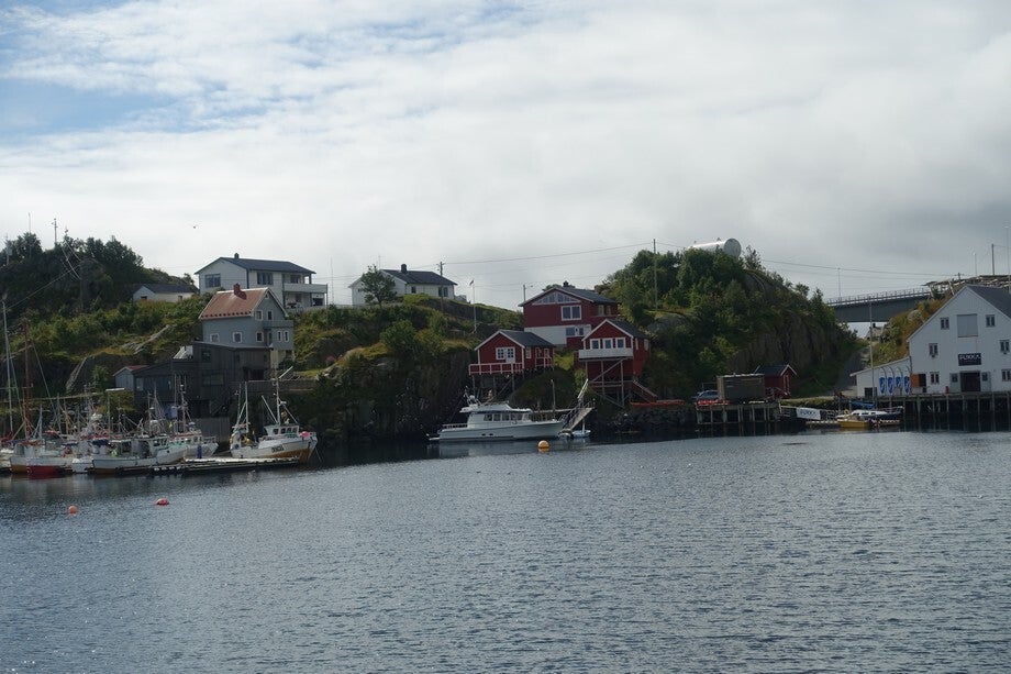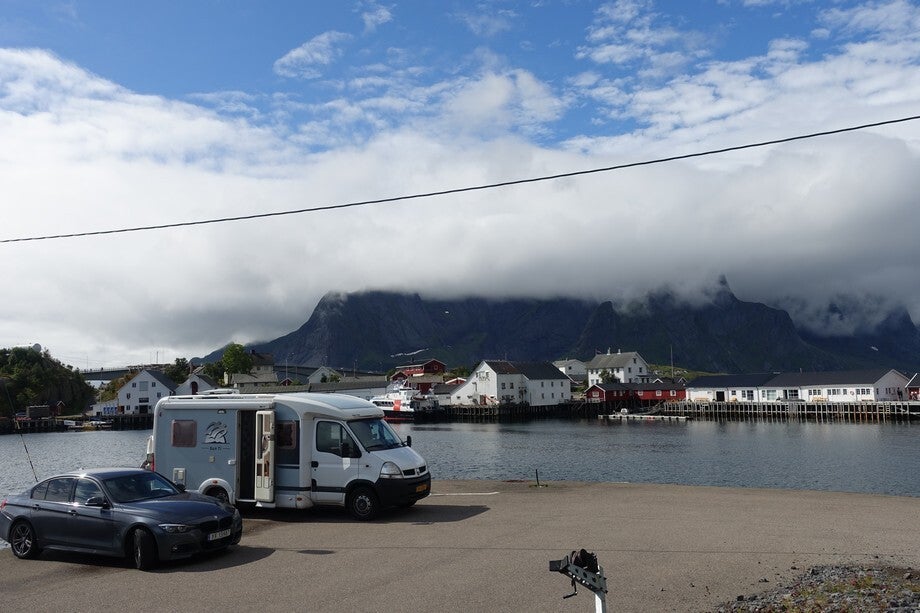 Hier vlakbij ligt Reine, ook leuk met veel rode huisjes op palen. Hier waren eindelijk visrekken met veel gedroogde vis eraan. Bij de grote parkeerplaats vonden we een goede gratis serviceplek, die hebben we maar gebruikt. Het was erg druk in dit dorp.