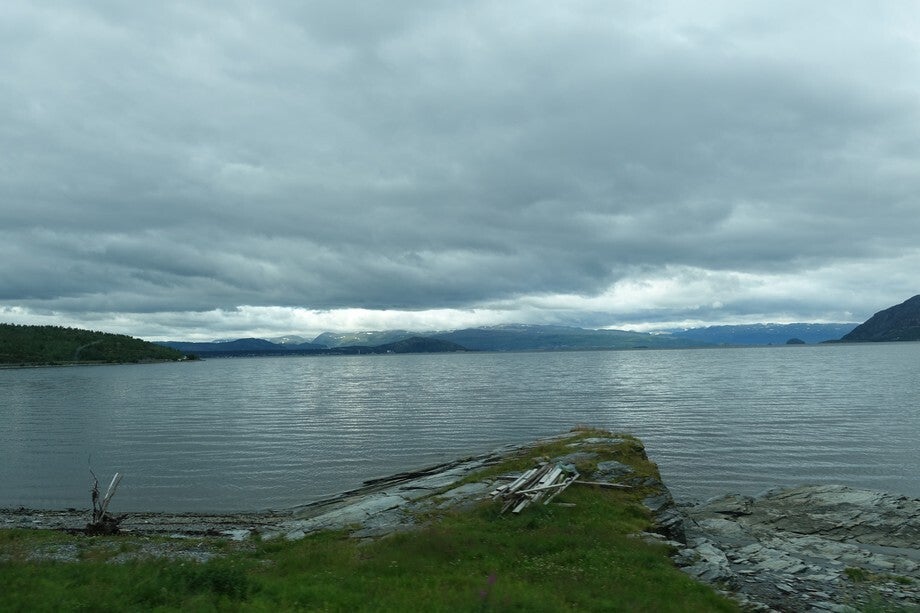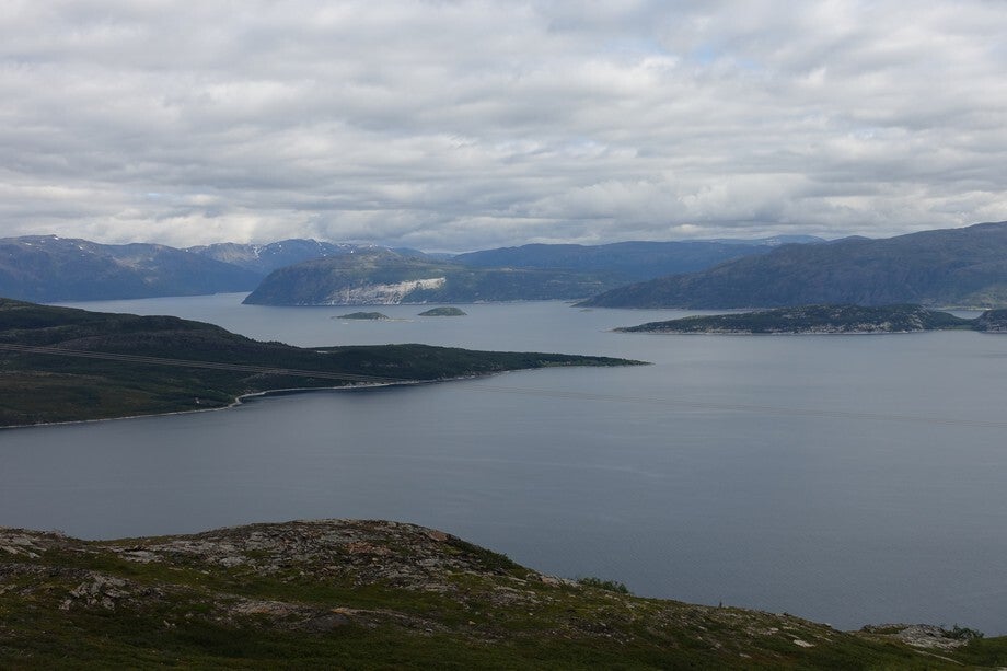 Hierna ging het afwisselend over hoogvlaktes en langs fjorden. Eén keer reden we heel hoog boven het water langs een fantastisch uitzichtpunt. Een stukje landinwaarts zijn ze bezig een tunnel aan te leggen. Als je die straks neemt mis je wel een heel mooi punt.