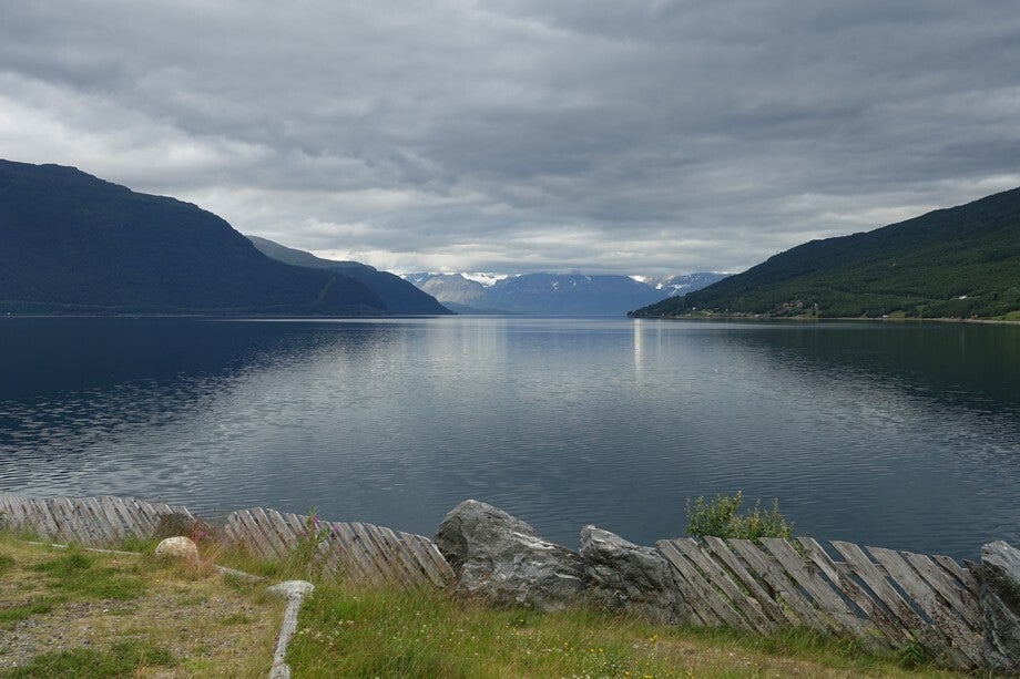 De route verder bleef mooi, door de bergen en langs fjorden en dorpjes. We zouden doorrijden naar het Vikingmuseum en daar blijven staan. De hele parkeerplaats was vol, dus maar verder gereden. Nu staan we op een P aan een fjord bij de Napp-Straum tunnel. We kijken mooi naar de overkant en over het water. Vanmiddag hebben we de heuvel waar de tunnel onder door loopt beklommen voor het uitzicht, ook op de camper.