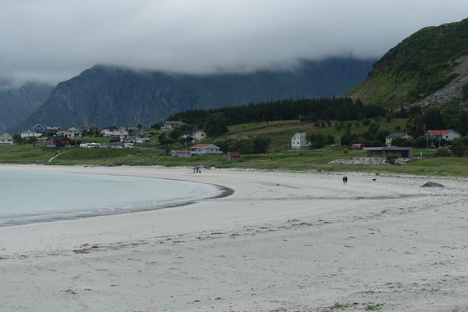 De koffiestop was vanmorgen bij Ramberg. Daar hebben we even op het mooie witte strand gewandeld.