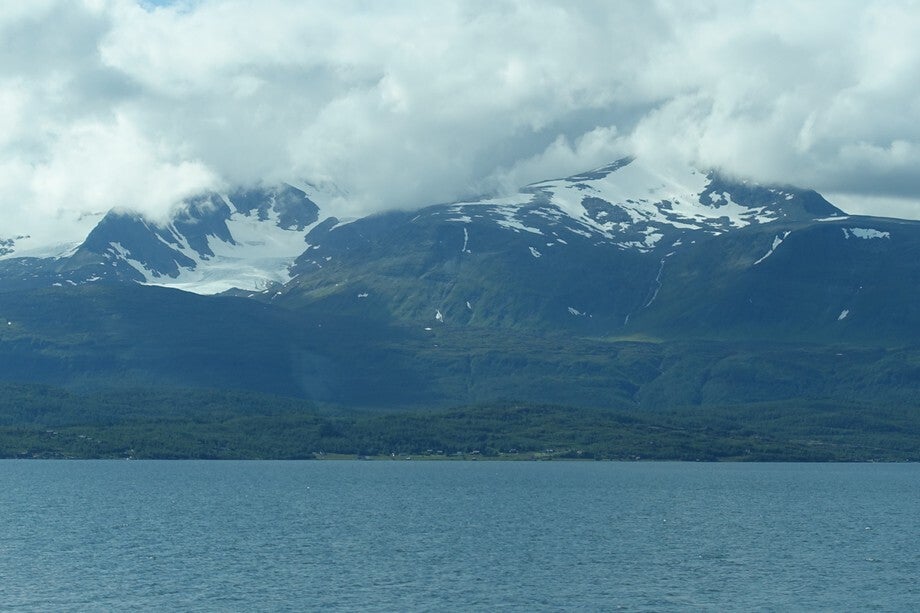Daarna weer verder langs de fjorden. De zon schitterde op het water. Aan de overkant lag nog sneeuw op de bergen. Bij Olderdalen kwam net de veerboot aan.
