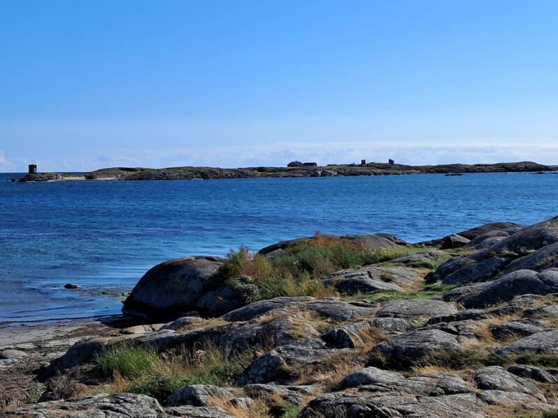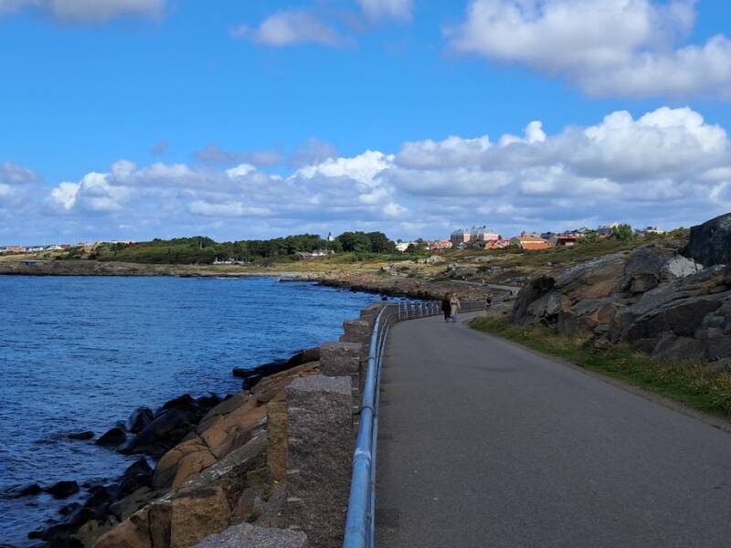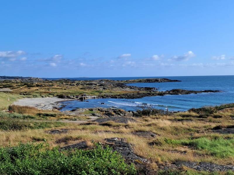 We zijn om de vesting heen gefietst en aan de andere kant gaat het fietspad verder langs zee. Dit pad loopt helemaal van Göteborg naar Helsingborg, 390 km lang, de Kattengatleden. Wij zijn tot de vuurtoren gegaan. Langs het pad zijn verschillende strandjes compleet met toiletten en kleedcabines.