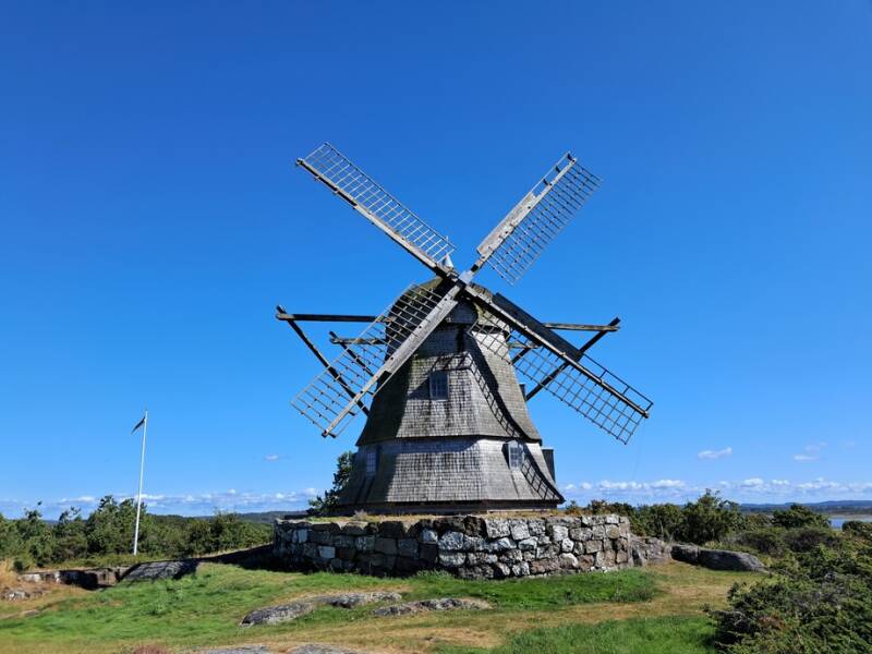 Bij een ander zijweggetje kwamen we langs een windmolen bovenop een heuveltje. Volgens het infobord was hij in 1899 gebouwd. De rest begrepen we niet want dat was allemaal in het Zweeds. Er wordt hier echter veel graan verbouwd dus is hij vast gebruikt om graan te malen.