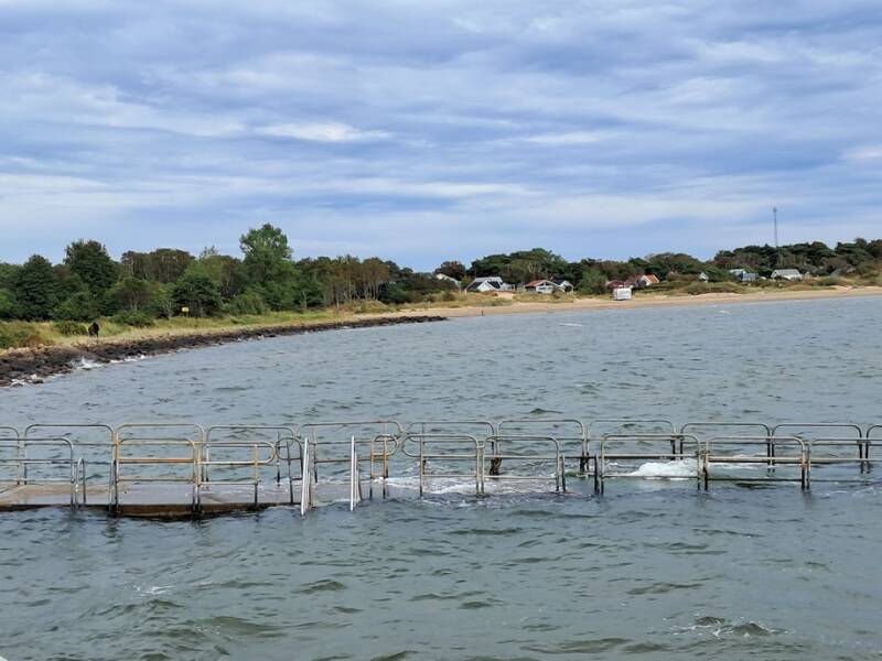 We zijn het pad gevolgd en af en toe een zijweggetje ingeslagen, die lopen meestal naar de zee. Bij een haventje vonden we een mooi plekje om te eten. Overal zijn zwemsteigers en er wordt nog best veel gezwommen.