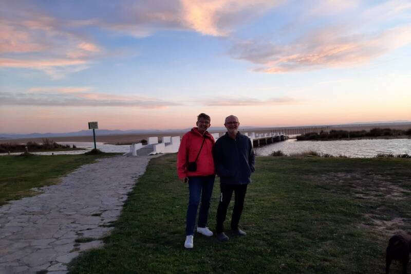Vera stuurde nog een mooie foto die ze gisteravond van ons had gemaakt bij de zonsondergang. Zoals je aan de jassen kunt zien koelt het ’s avonds behoorlijk af.