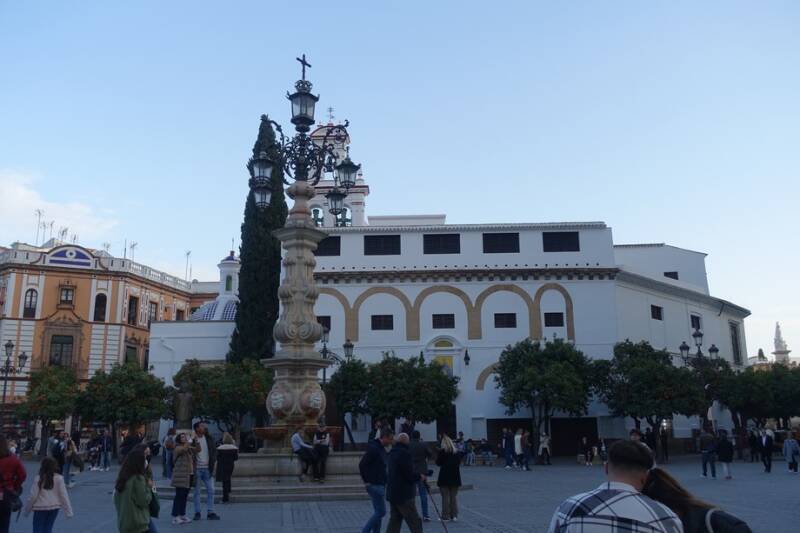 Hierna bracht de bus ons naar het centrum. We wandelden achter de gids aan naar het Alcazar. Onderweg kwamen we langs een hele oude hoge ficus, langs het balkon uit de opera Carmen en door de vroegere Joodse wijk met smalle straatjes en pleintjes met sinaasappelbomen en langs de enorme kathedraal.